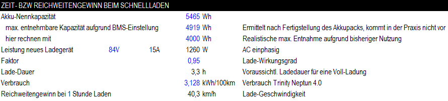 Aufgrund der geringeren Abmessung (siehe auch Punkt 3) habe ich mich für das 15A-Ladegerät entschieden. Was dies nun bezüglich der Lade-Geschwindigkeit bedeutet, habe ich wieder in einer kleinen Excel-Rechnung festgehalten: