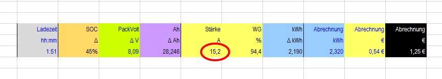 Da ich meinen Akku selbst gebaut habe, hänge ich an ihm wie an einem Haustier. Wir beide haben jeden Tag moderaten Auslauf und vor allem er wird zuhause auch sehr moderat gefüttert: 5 Ampere - manchmal dauert das die ganze Nacht. Als ich ihm erzählte, dass wir künftig etwas grössere Ausflüge unternehmen werden, er daher auch unterwegs gefüttert würde, war tagsdarauf angesagt für Klarheit zu sorgen, als ich auf seinem Display das grosse gelbe "M" entdeckte und natürlich sofort wusste, was er geträumt hatte. Ich stellte also klar, dass die Fütterung auch unterwegs moderat bleiben würde ... Ok, mit dem Vergleich Akku/Haustier habe ich etwas overpaced, aber ich denke es kommt rüber, dass ich den Akku auch unterwegs schonend behandeln möchte. Für die folgende kleine Tabelle habe ich nach einem Blick ins Datenblatt der im Akku verbauten Sekundärzelle einen einfachen Excel-Dreisatz bemüht: Die Erläuterung ist etwas Akku-Mathematik:
