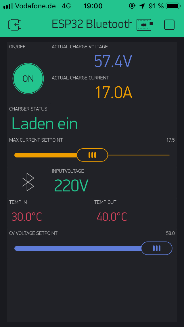 Verwendet habe ich einen ESP32 Microcontroller mit einem TJA1051 CAN Transmitter. Darauf läuft neben einem PID Regler auch das Blynk-Framework, welches die einfache Gestaltung und Interaktion mit einer App via Bluetooth ermöglicht. Mit der App kann ich den Ladestrom und die Ladeschlussspannung (CV) einstellen sowie das Ladegerät ein- und ausschalten. Zusätzlich bekomme ich Informationen zur Temperatur des Ladegerätes und zur Netzspannung.