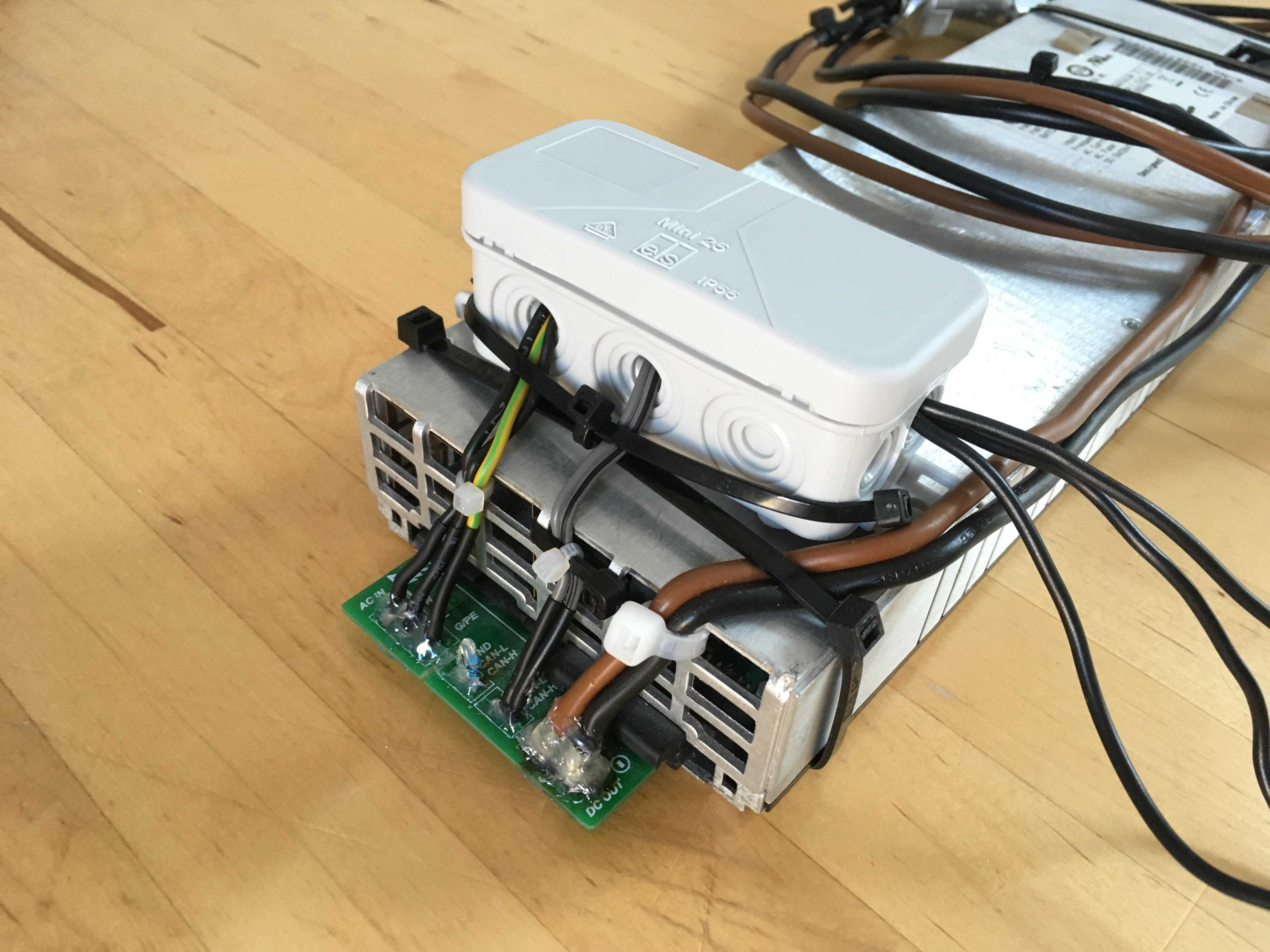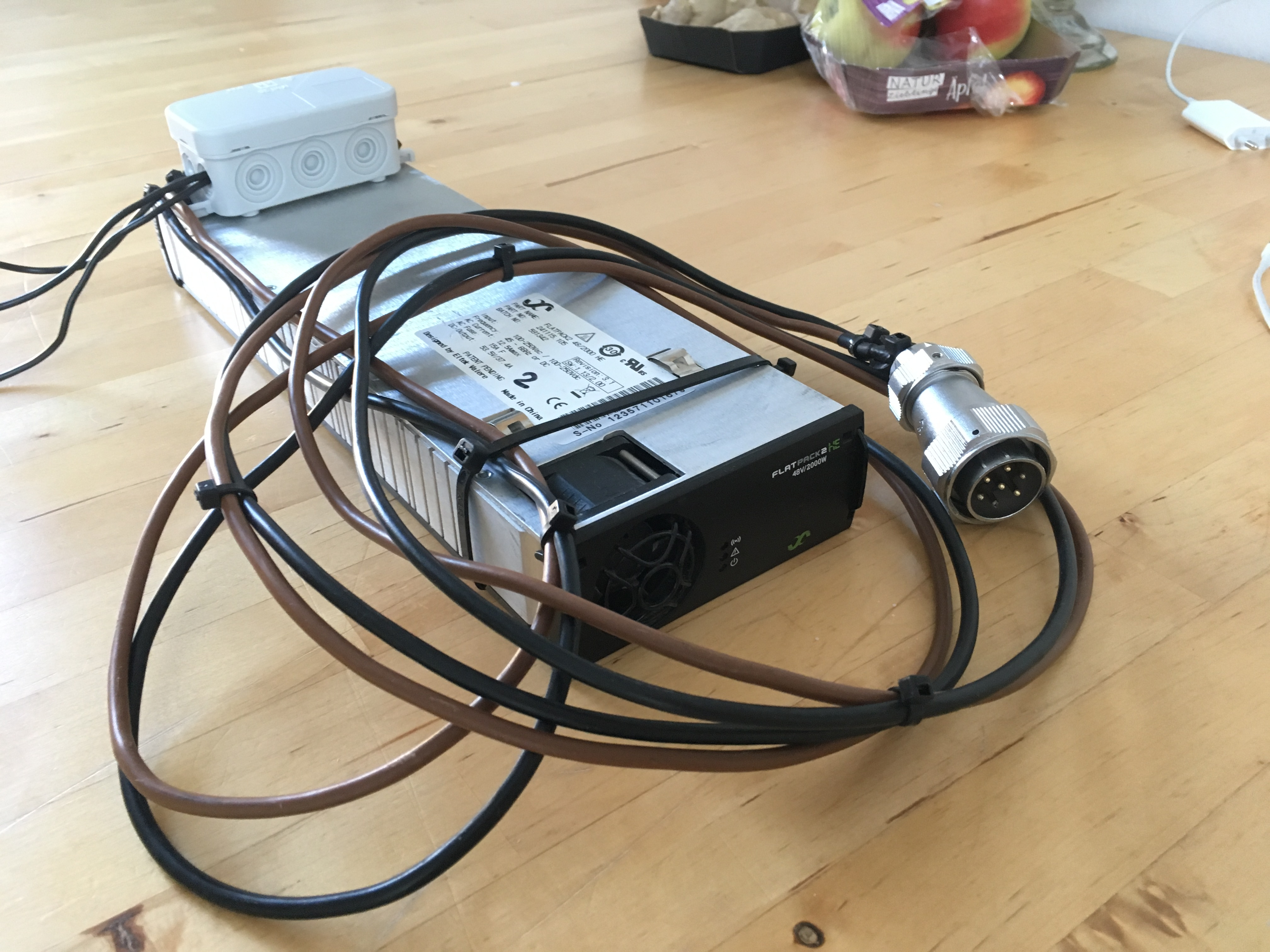 Da Emmy leider kein Ladegerät mitgeliefert hat und ich kein teures originales Ladegerät kaufen wollte, habe ich nach Alternativen gesucht. Ich hatte zufällig noch ein Eltek Flatpack herumliegen, welches mit einer maximalen Spannung von 57,6 V eigentlich perfekt für die Akkus ist. Allerdings musste eine Stromregelung her, denn der maximale Strom von 41,7 A ist eindeutig zu hoch.