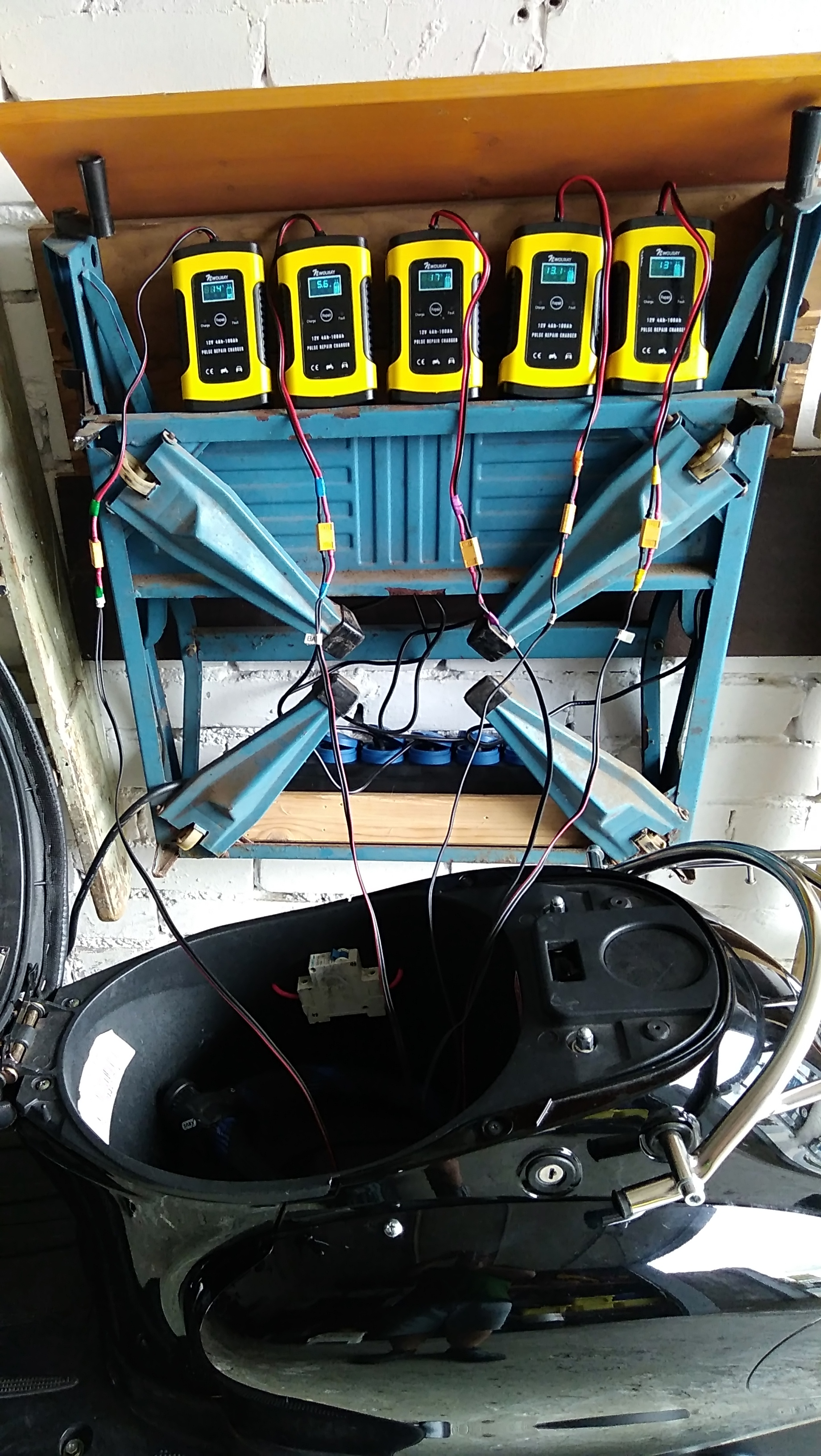 da die12V Blei-Akku-Blöcke im Verbund immer einzeln kaput gehen (auch wenn es dort drin nur eine von 6 2V-Zellen trifft) sollte Einzeln-Laden eigentlich schon nützlich sein. Wenn fünf 12V-Blöcke seriell mit Ladespannung 72 Volt geladen werden und eine der 30x2V-Zellen hat (altersbedingt) einen Zellen-Kurzschluss, reißt der defekte Block die anderen vier mit anliegender Überspannung gleich mit ins Unglück und wenig später sind alle fünf Schrott. So kümmert sich jeweils ein Ladegerät um jeden Block und es muss im Defekt-Fall dann (zunächst) nur einer ersetzt werden.