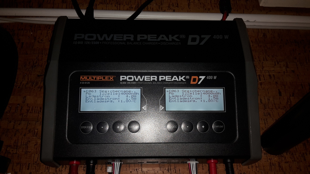Es handelt sich um ein Multiplex PowerPeak D7 Lader mit zwei getrennten Ladeausgängen für meine Modellbau-Akkus NiMH und LiPo.