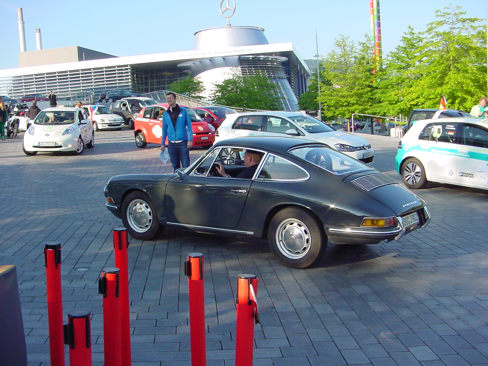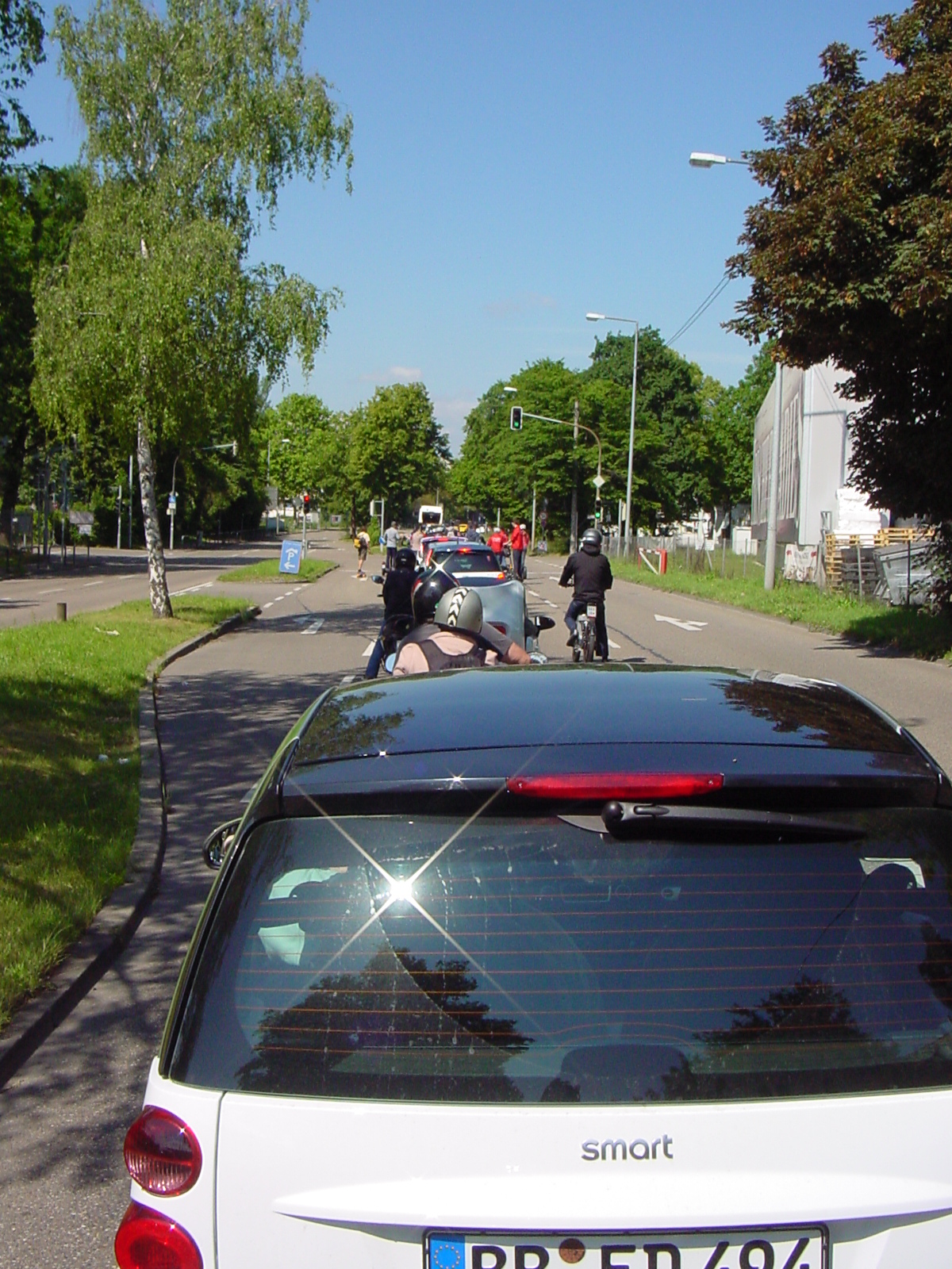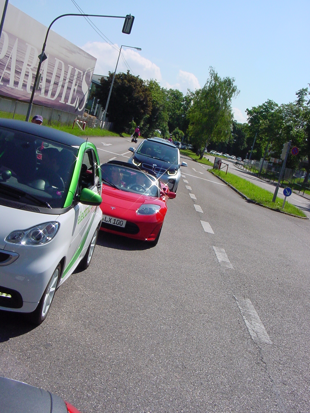 Nach einigen kurzen Ansprachen von Louis Palmer, Baden-Württembergs Verkehrsminister Winfried Hermann, dem Stuttgart OB Fritz Kuhn, dem Daimler Vertreter H. Schenk und von der Landesagentur für Elektromobilität, Franz Loogen, setzte sich der Tross kurz nach 10 Uhr langsam in Bewegung und begann die Umrundung der MB-Arena, die dank einem Filmteam an der Unterführung aufs Wasengelände bald in einen ausgewachsenen Stau ausartete. Mein Blick nach vorn: