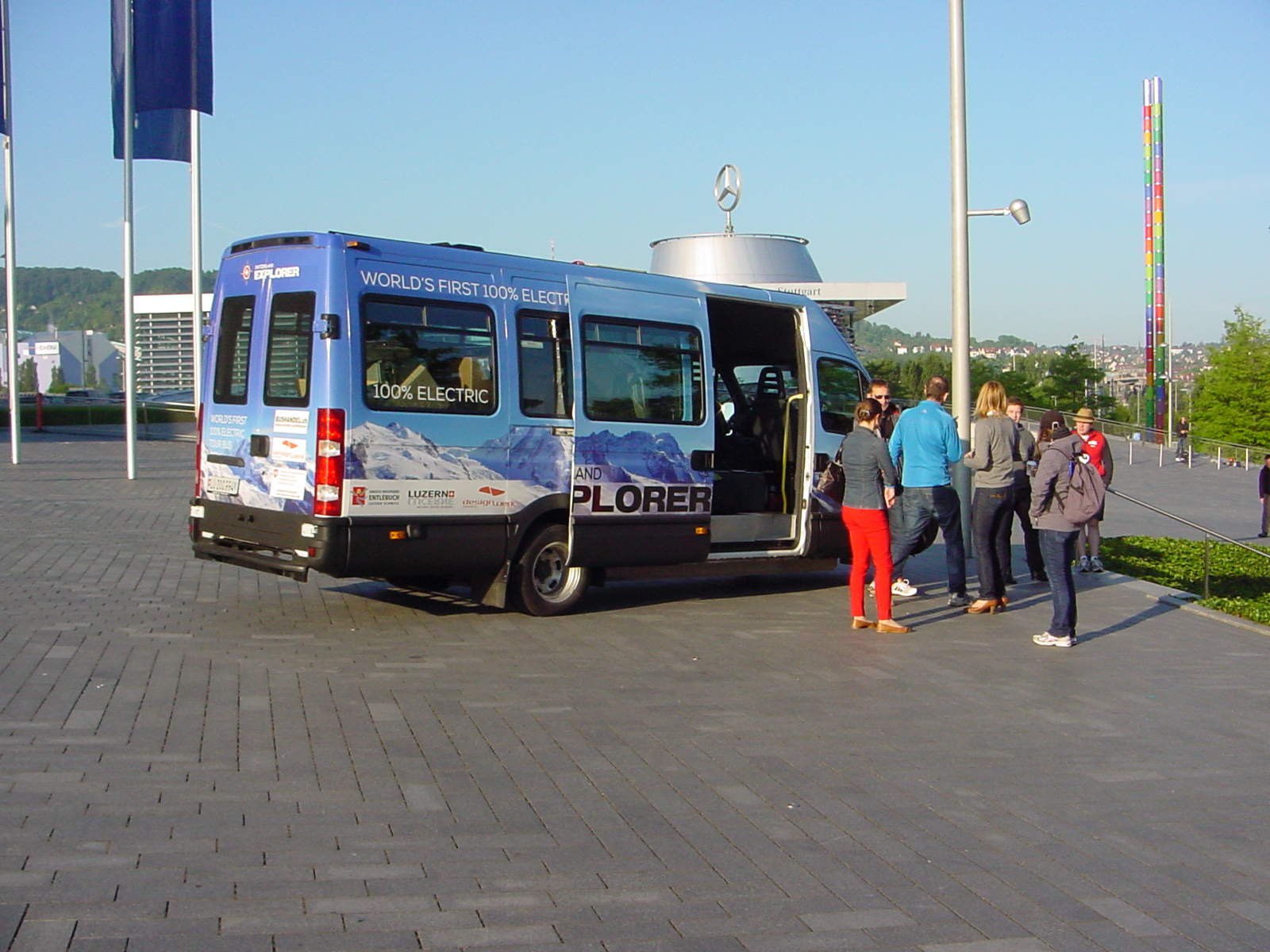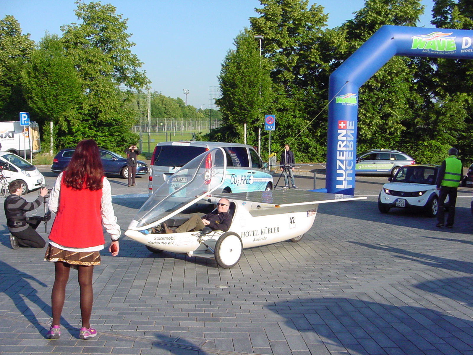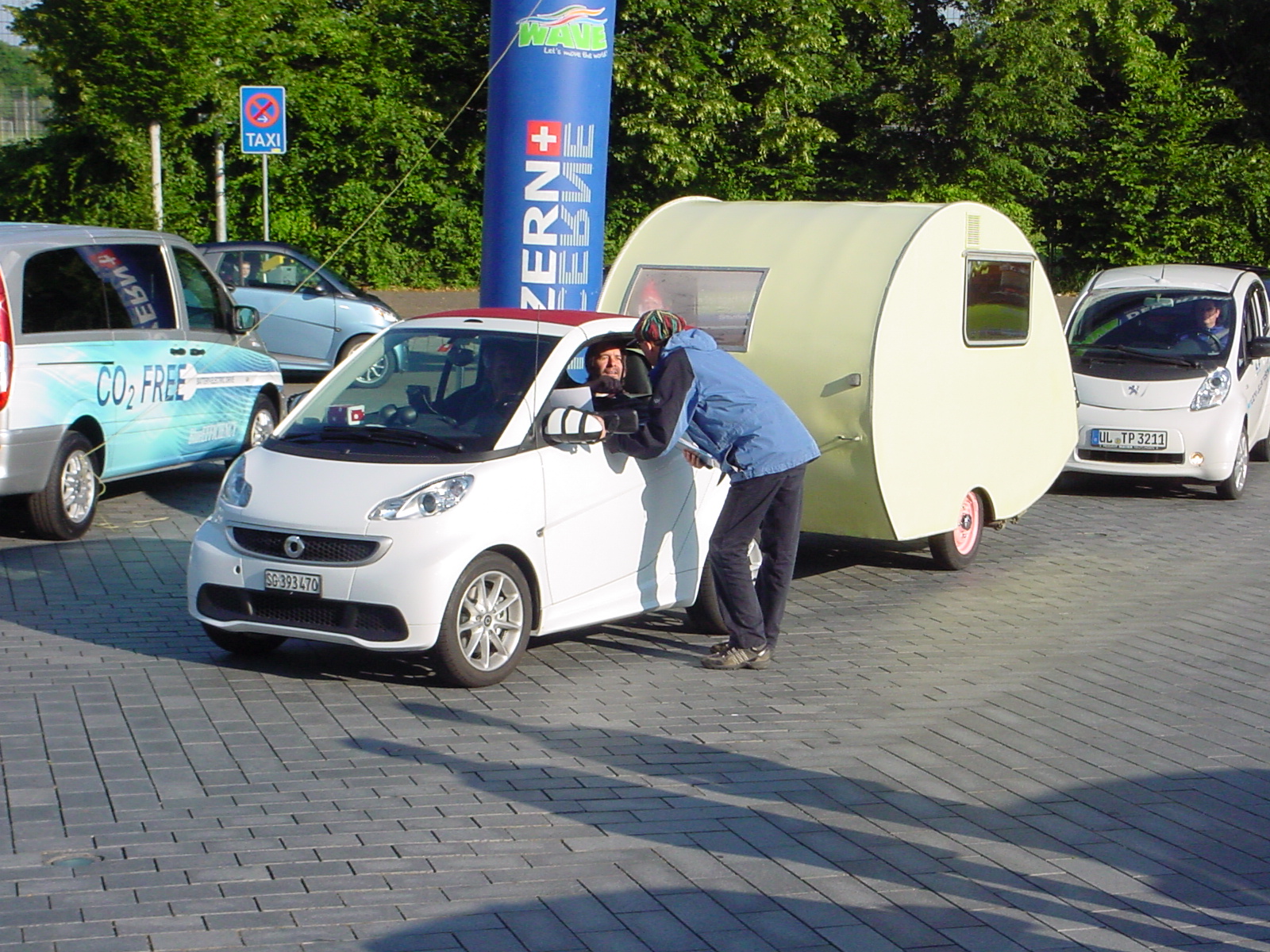 Nach einigen kurzen Ansprachen von Louis Palmer, Baden-Württembergs Verkehrsminister Winfried Hermann, dem Stuttgart OB Fritz Kuhn, dem Daimler Vertreter H. Schenk und von der Landesagentur für Elektromobilität, Franz Loogen, setzte sich der Tross kurz nach 10 Uhr langsam in Bewegung und begann die Umrundung der MB-Arena, die dank einem Filmteam an der Unterführung aufs Wasengelände bald in einen ausgewachsenen Stau ausartete. Mein Blick nach vorn: