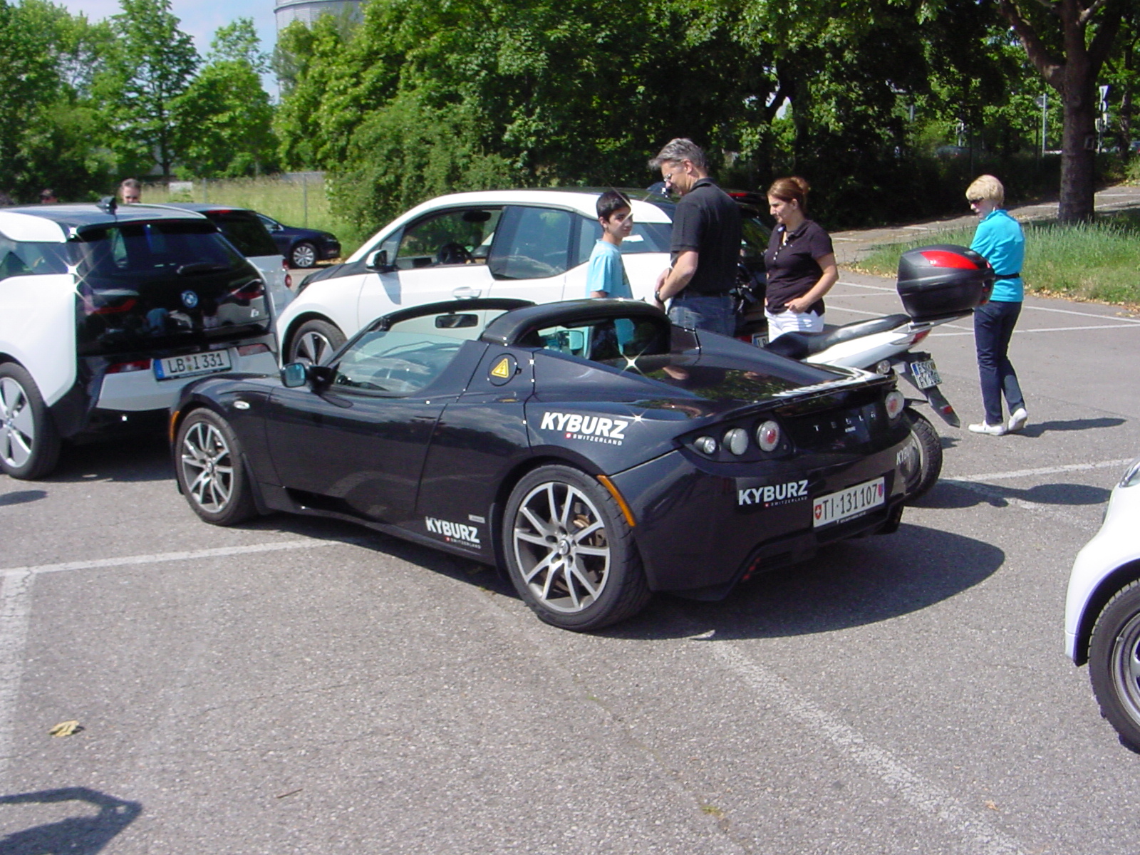 Schlussendlich kamen wir auf dem Wasen-P9 an, wurden durchs Ziel hindurch gezählt (ich war die Nummer 281, also mitten drin in der Schlange) und fotografiert, und fuhren dann an unseren Platz links oben in der Herzumrandung. Ich kam zum Stehen neben einem Schweizer Tesla Roadster, hinter zwei i3, und vor der gesamten Deutschen Telekom Smart ED Armada: