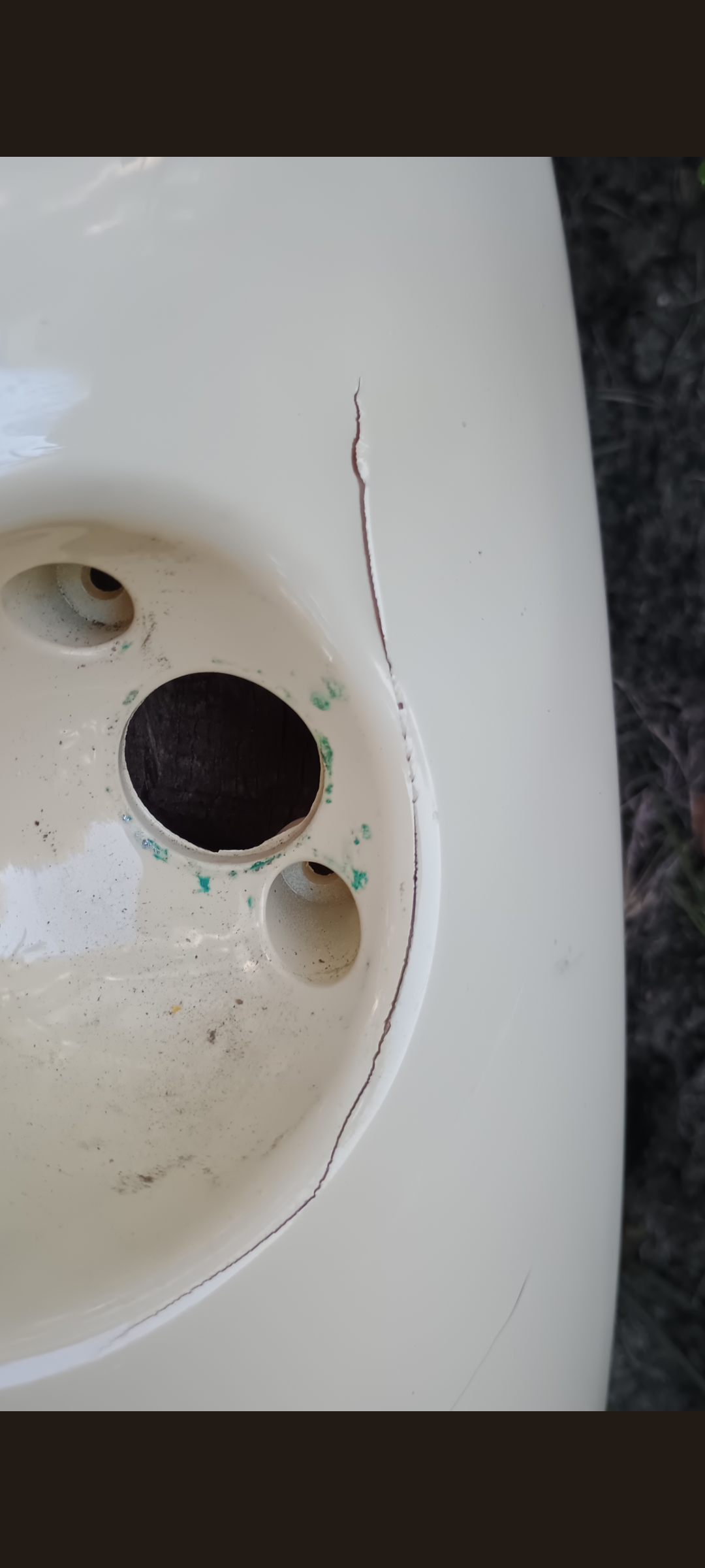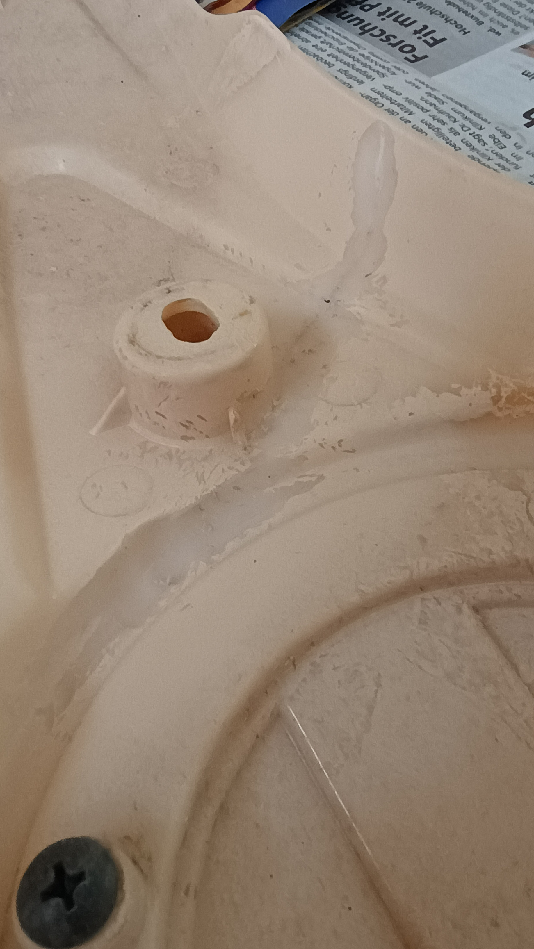 Die 2 Teile waren sehr schlecht geklebt und hatten noch mehr Risse, alles etwas freigefräst, inen mit glühendem Schraubendreher etwas verschmolzen und 2K drüber, mal sehen wie lange es hält. Habe zur Montage mal noch 4 Gummischeiben untergelegt
