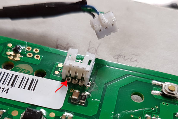 @Eule: Für Dich hier nachgereicht noch die Bilder. Der makierte Stecker der Signalleitungen war lose und die markierte Lötstelle des linken Kontaktes auf dem Akkuboard schlecht. Ich habe nachgelötet und den Stecker wieder richtig eingesteckt. Die Akkuanzeige im Tacho arbeitet damit jetzt seit einem Jahr wieder einwandfrei (zuvor oben beschriebenes Fehlerbild nach 6500km). Da der Fehler mit dem Akku wanderte (ein Akku i.O. einer mit sporadischen bis permanenten Akkuladezustand-Anzeigeausfälle im Tacho, war klar, dass der Fehler im Akku liegen musste).