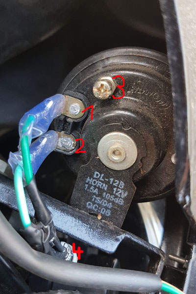 Ich habe gerade eben an der Hupe meines Revoluzzers 6 Ohm Innenwiderstand gemessen. Bei deiner Hupe 12 Volt / 1,5 Ampere müssten das dann so um die 8 Ohm sein. Ich würde fest 12 Volt an die Kontakte 1 und 2 anschließen, und dann versuchen die Stellschraube 3 in beide Richtungen zu drehen. Falls das nichts bringt, einfach eine neue Hupe einbauen.