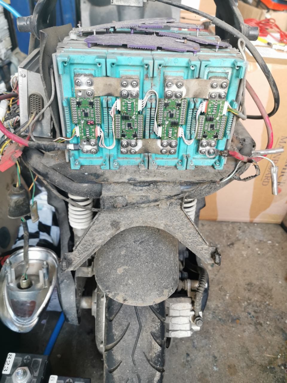 Die ersten drei Fehler habe ich schon mal beseitigt. Der hintere Akkublock hat feuchtigkeit abbekommen, da sind die BMS Platinen am modern gewesen. Ausgebaut, gereinigt, nachgelötet, geprüft, eingebaut. Eine ist defekt, leitet aber die Signale richtig durch. Hab gleich mal einige Ersatzplatinen und Verbindungskäbelchen bestellt.