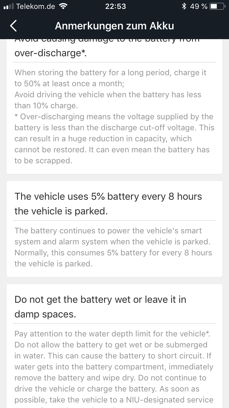 Richtig, Niu sagt sogar in der App das je 8h , 5% Akku flöten gehen.JoeMacFox hat geschrieben: Fr 3. Aug 2018, 19:32