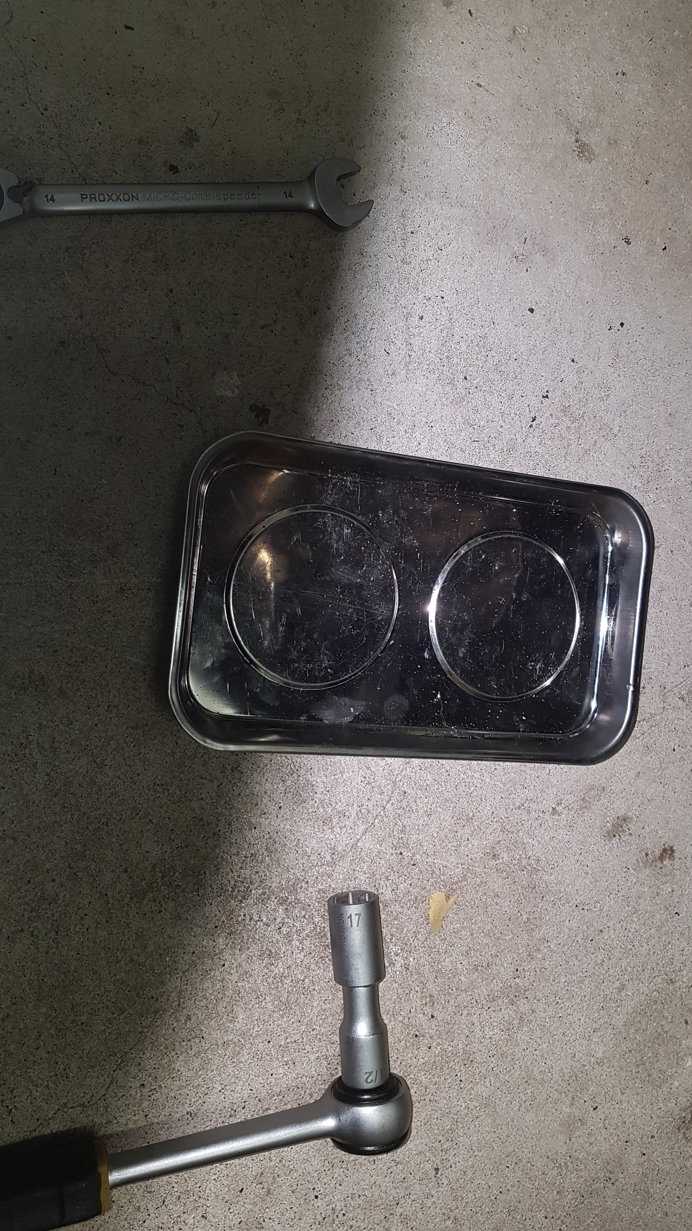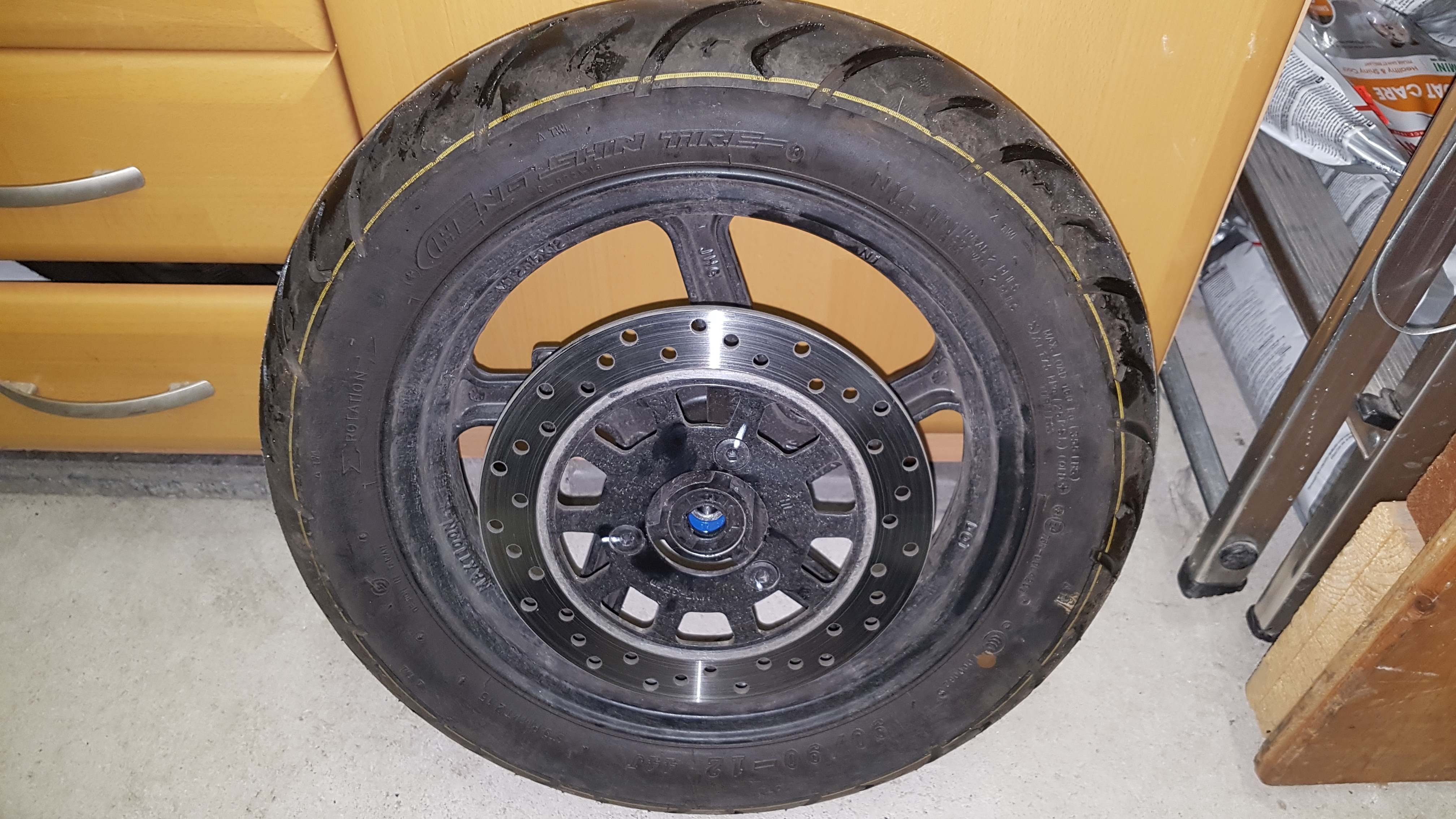 Der Ausbau ging wie folgt, hinten im Topcase 4 Paletten ca. 18 kg Hundefutter rein. Jetzt kommt vorn das Vorderrad hoch. Dann einen ( Ausbaurichtung in Fahrtrichtung ) 14 Ratschenschlüssel für die rechte Schraube am Radbolzen und links die Plastikmutter entfernt und eine 17 Nuss drauf. Im Gegesatz beide gelöst und Mutter abgezogen. Bolzen nach rechts rausgezogen und das Vorderrad festgehalten und langsam herausgezogen. Das Vorderrad ist erstaunlich leicht und sehr schnell ausgebaut. Die beiden Hülsen rechts und links aus dem Vorderrad herrausgezogen und in der Schale abgelegt. Nun sind die leicht versteckten ( ich persönlich finde das gut von NIU die Radlager so, etwas zu schützen ) Radlager. Nun den Radbolzen wieder von links nach rechts eingeführt und die beiden Distanzhülsen zwischen den Stossdämpfern auf den Radbolzen aufgeführt. Das was eigendlich schon. Reifen runter und den anderen wieder druff. Radbolzen wieder abgezogen und die Distanzhülsen wieder in die Gummimuffen am Vorderrad eingesteckt. So wer will kann den Radbolzen leicht mit Lagerfett einpinseln. Das Vorderrad nun wieder vorsichtig mit der Bremsscheibe zuerst in die Bremsbacken eingeführt und so zentriert das der Radbolzen nun leicht wieder durch die Mittelachse des Vorderrad hindurchführen und fest anziehen. Das Anziehen kann man nach Vorgabe ( keine Ahnung wieviel NM ) des Herstellers anziehen. Ich handhabe das immer so wie bei meinem alten Silencio Roller. Passt.