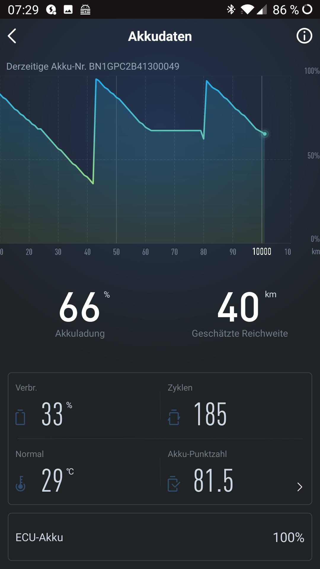 Die teilweise beschriebenen Akku-Probleme kann ich auch nicht nachvollziehen. Mein Akku hat noch nie Probleme gemacht. Allerdings behandle ich den auch sehr pfleglich: Roller steht immer in der Garage, lade immer nur bis ca 80-85% und habe noch nie unter 12% entladen. Lade meistens täglich nach der Arbeit über Zeitschaltuhr gesteuert. Ladeleistung ist ca. 15% pro Stunde, dann hänge ich den Roller je nach Akkustand 1-2 Stunden an den Strom. Ein- bis zweimal im Monat lade ich auf 100%.