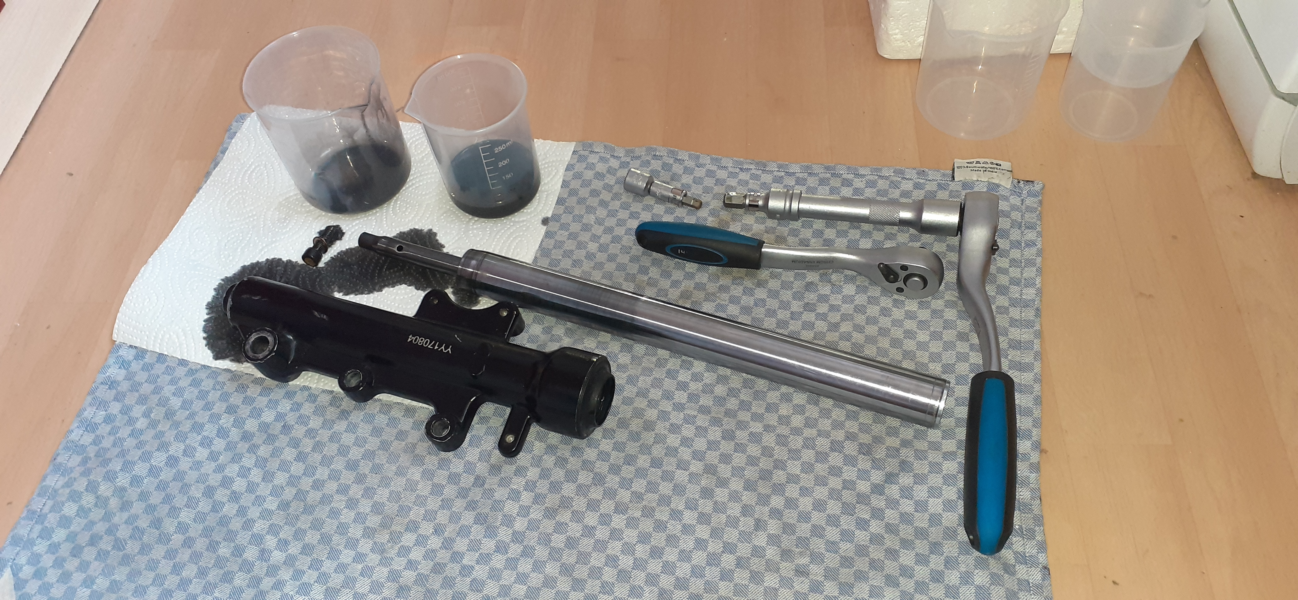 Eddi: okay waren noch ein paar Milliliter mehr, die noch aus dem Gabelholm getropft sind. Musste erst mal gucken wie der Aufbau ist. Ca. 100ml pro Holm schätze ich.