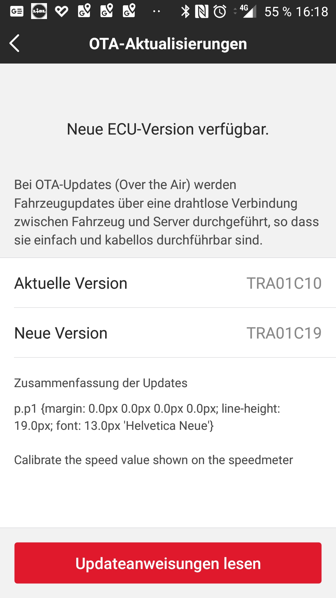 Ja, es kann sein, das die Anzeige der Verfügbarkeit etwas später kommt. Da laut einem Post von NIU hier im Thread weiter oben - ja sie sind auch schon mal hier im Forum aktiv - könnte es auch sein, das Firmware TRA01C10 Voraussetzung für die Version TRA01C19 ist. Schließlich kamen damit größere Änderungen und die TRA01C10 ist auch die erste Version, die einheitlich für 2017er und 2018er Modelle herauskam. TRA01C19 scheint nur kleinere Fehler zu korrigieren. Die einzige sichtbare Änderung scheint an der Geschwindigkeitsanzeige zu erfolgentiger46 hat geschrieben: Di 15. Jan 2019, 14:09 So ich habe nun meinen gebraucht gekauften Niu N1S kontrolliert welche Version oben ist und welche er mir anzeigt: