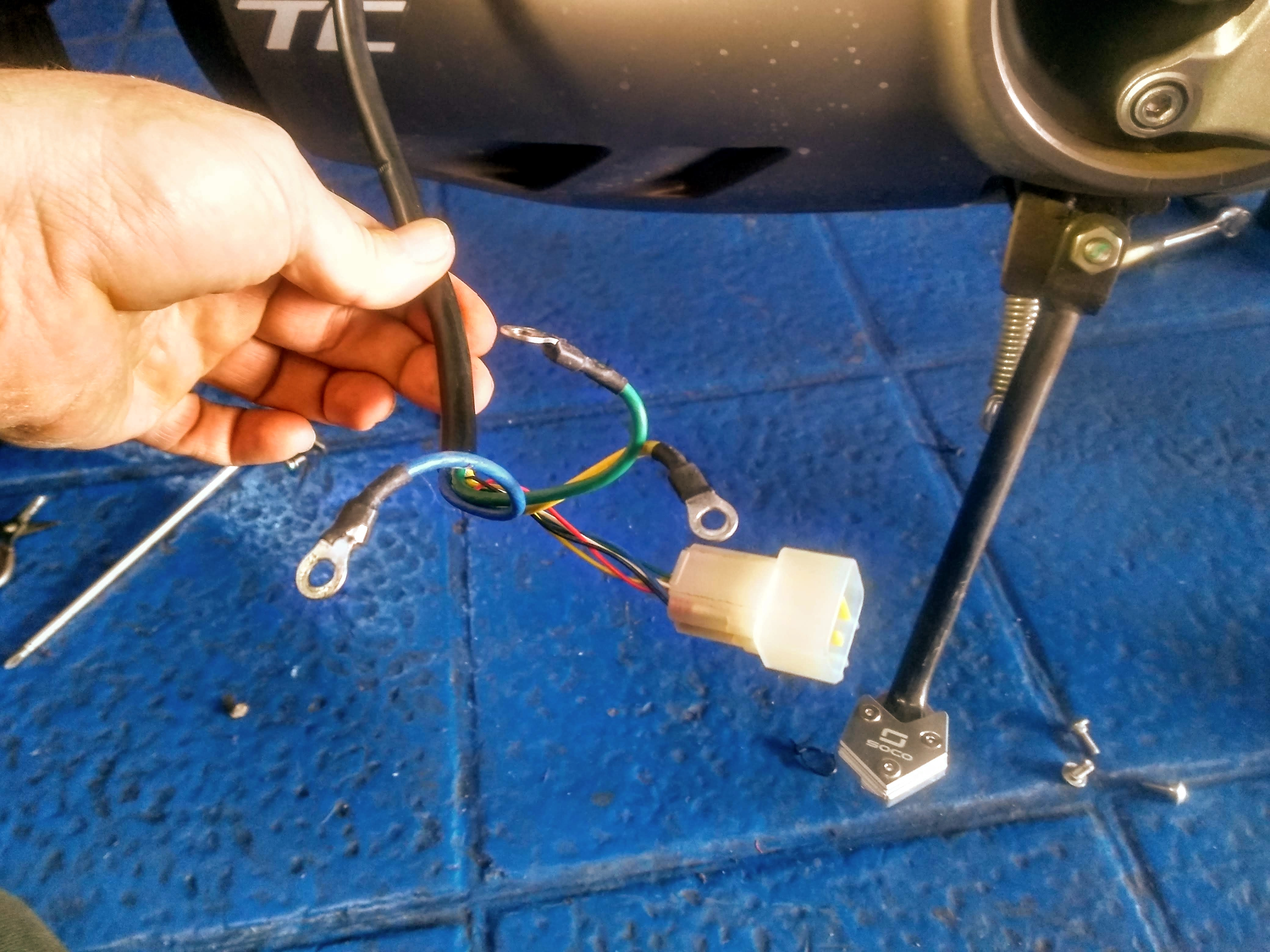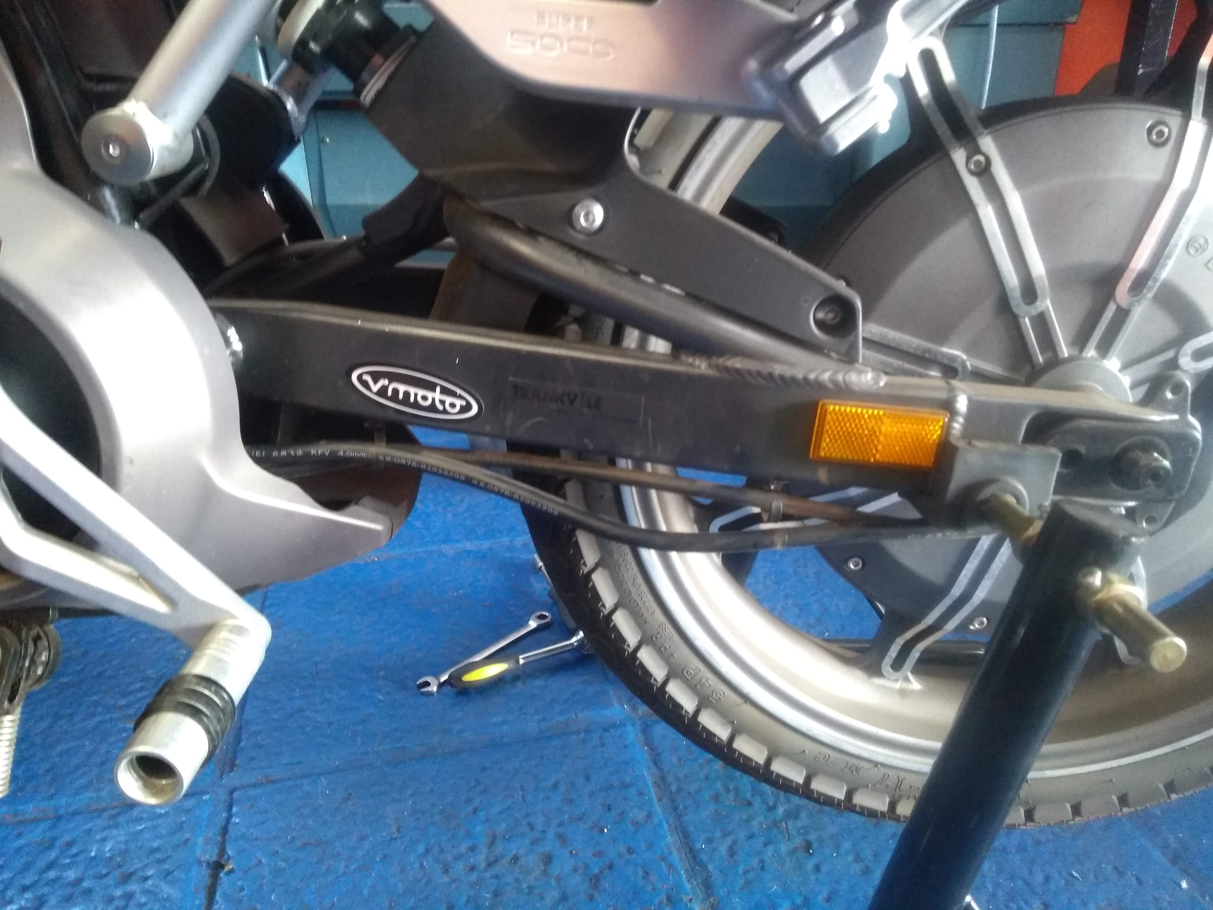 Das Hinterrad ist nicht wie üblich auszubauen, denn das Stromkabel zum Motor hängt dran. Es sind also vor dem Ausbau 5 Kabelbinder zu lösen (inkl 2 unter der Plastikverdeckung). Das linke lackierte Seitenteil muss dazu entfernt werden und das darunter angeklipste graue Bodenteil gelockert werden. Der Controller nach vorne ausbauen und die Kabel U, V, W lòsen, ausserdem den Verbundstecker. Beim Einbau genau umgekehrt.