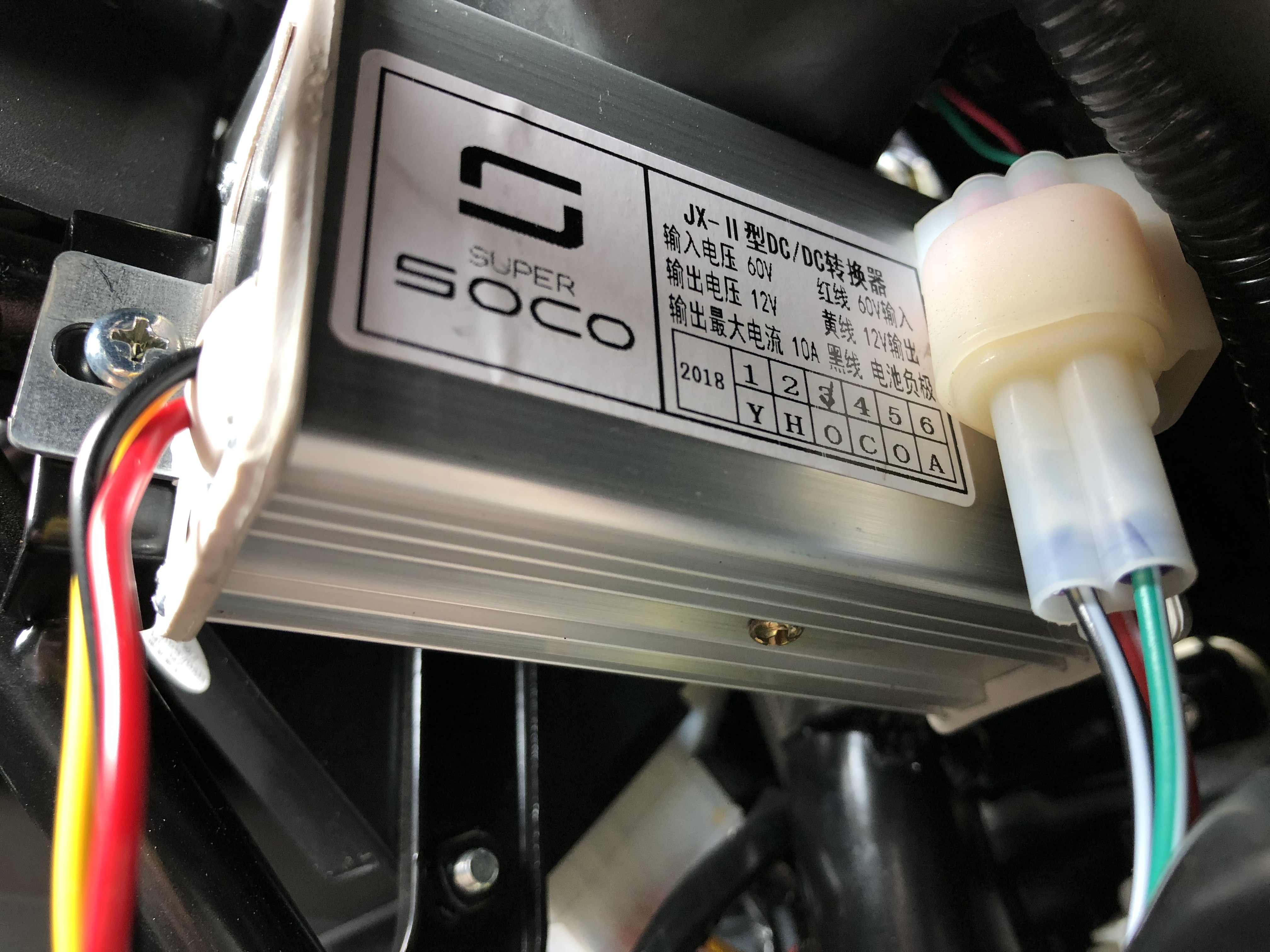 3.: Dann sollte es so aussehen: Oben rechts der silberne Kasten ist der DC/DC Wandler, die genaue Belegung der einzelnen Adern müsstest du dir einmal rausmessen. Dort kannst du dann wahlweise 60 oder 12 Volt abgreifen. Kontrolliere dann wenn du die Soco schon so weit offen hast am besten auch einmal welcher DC/DC Wandler verbaut ist. Bei der TC ist es dieser hier: Die Leistung sollte für einen kleinen Verbraucher wie zum Beispiel ein Navi aber ausreichen.