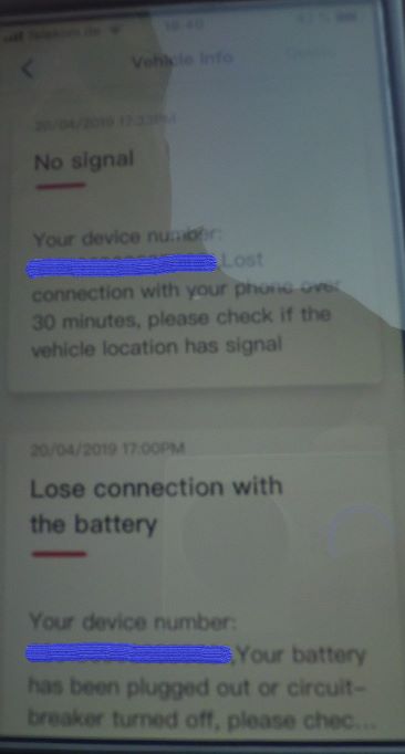 In der App identifiziert man sich mit seiner Handy Nummer ( Quittung per SMS ) und gibt die EMEI Nr. des 3G GPS Moduls an. Diese ist u.a. zu finden die auf einem Ausdruck zusammen mit der Fahrgestellnummer. EMEI und FGNr. sind einander zugeordnet.