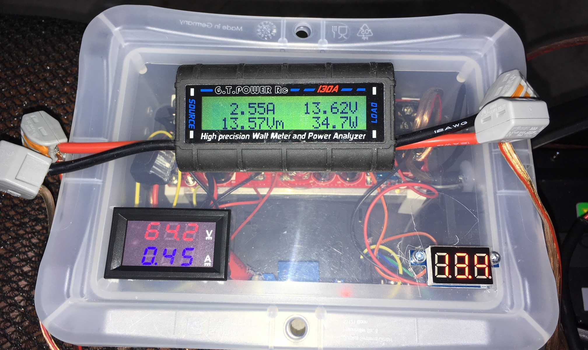 Bild: Messgerät Rechts und Oben Eingangsspannung 13,5V / Strom 2,44A /