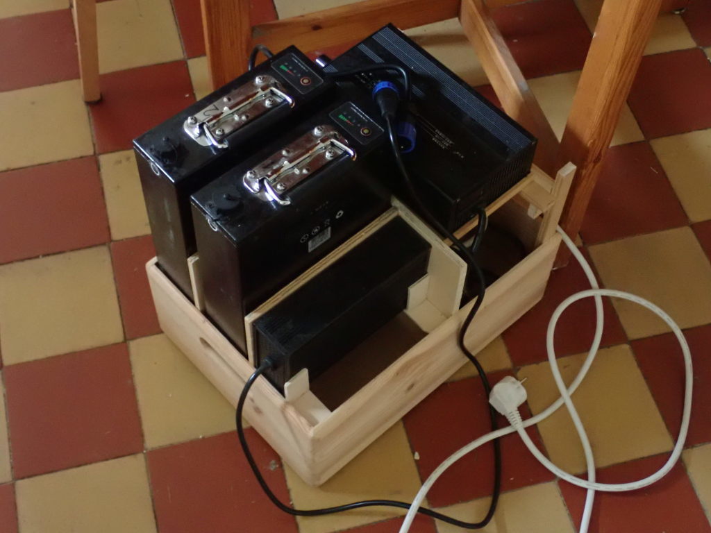 Das musste doch besser gehen! So habe ich aus einer gerade leer herumstehenden Holzkiste, etwas Sperrholz und ein paar Leisten eine Ladekiste gebaut, in der beide Akkus, die beiden Ladegeräte und die zugehörige Steckdosenleiste untergebracht sind. So kann nichts mehr kippen: