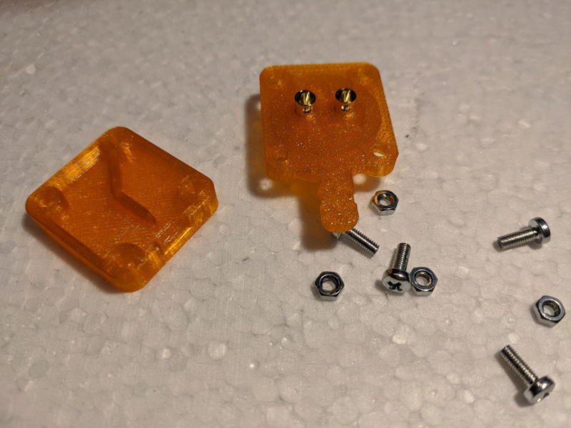 Wer einen guten 3D-Drucker sein Eigen nennt und mit dem Lötkolben geschickt ist, kann sich selbst einen passenden Stecker für ein eigenes Ladegerät basteln. Vergoldete Stiftkontakte mit 3,5mm (für die 50A-Leitungen, Pin 1 & 2) gibt's bspw. bei Pollin (Bestellnr.: 820126). Je vier M3'er Muttern und Schräubchen (8mm Gewindelänge) sind dafür dann noch nötig.