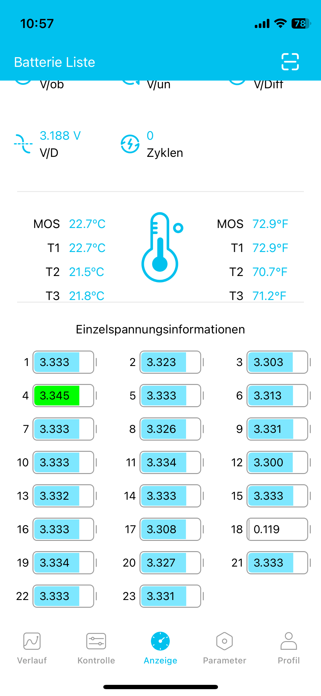 Der Akkublock ist technisch neu und unbenutzt, wurde aber mit einem defekten Zellstring geliefert. Die beiden Zellen des 18. Strings haben nur noch wenige Millivolt Spannung und sind tiefentladen bzw. defekt. Ursache war eine permanente Stromaufnahme des BMS (Bluetooth-Modul), das den betroffenen String über die lange Transportzeit entladen hat.