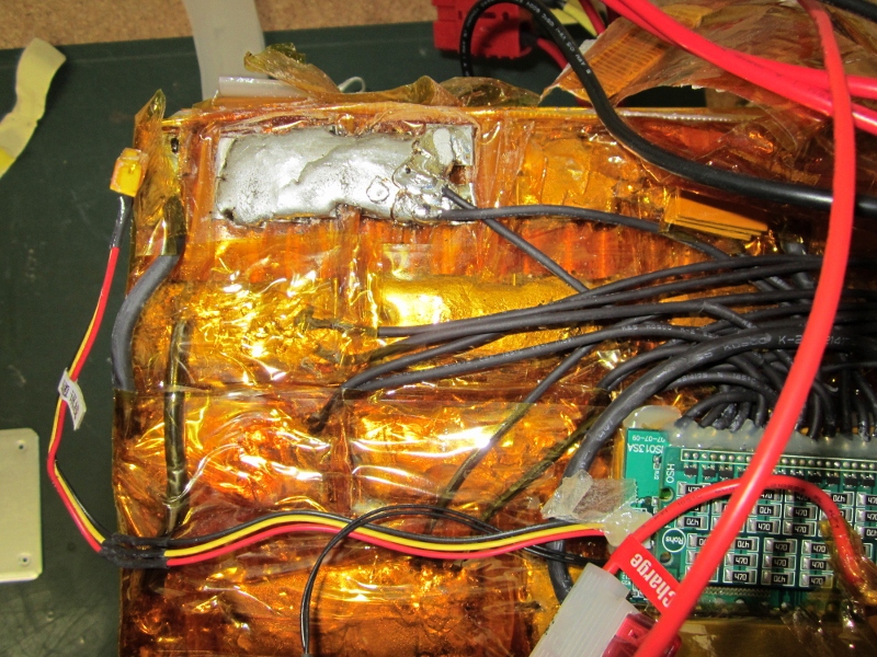 Sehen wir mal das Positive zuerst: das Ding hat ein BMS (naja, die Lastwiderstände sind niedlich) und anscheinend einen Temperatursensor. Kabel sind einigermaßen isoliert, zusätzlicher Heißkleber verleiht Stabilität. Was mir gar nicht so gefällt, ist der fette Lötzinnklecks in der oberen linken Ecke. Das spricht für recht lange Einwirkung eines Lötkolbens mit entsprechender Hitzeabgabe im Umfeld.