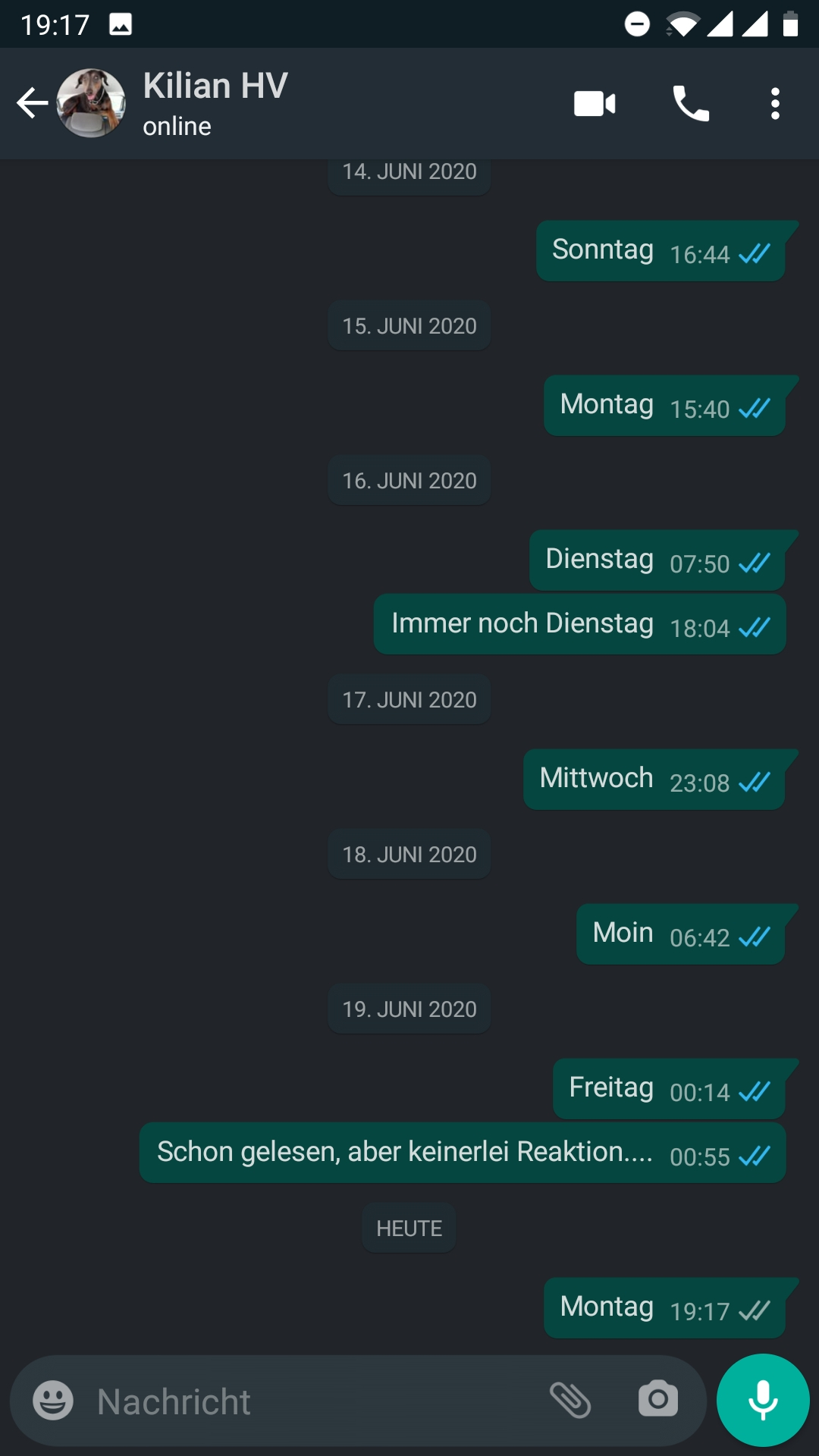 Heute hat er auf ein paar Anrufe nach 23 Uhr etwas ungehalten reagiert und sogar zurück gerufen. Er hat mir gleich verschiedene Sachen angedroht, ich habe mich gefreut das er weiß, was ich von ihm will