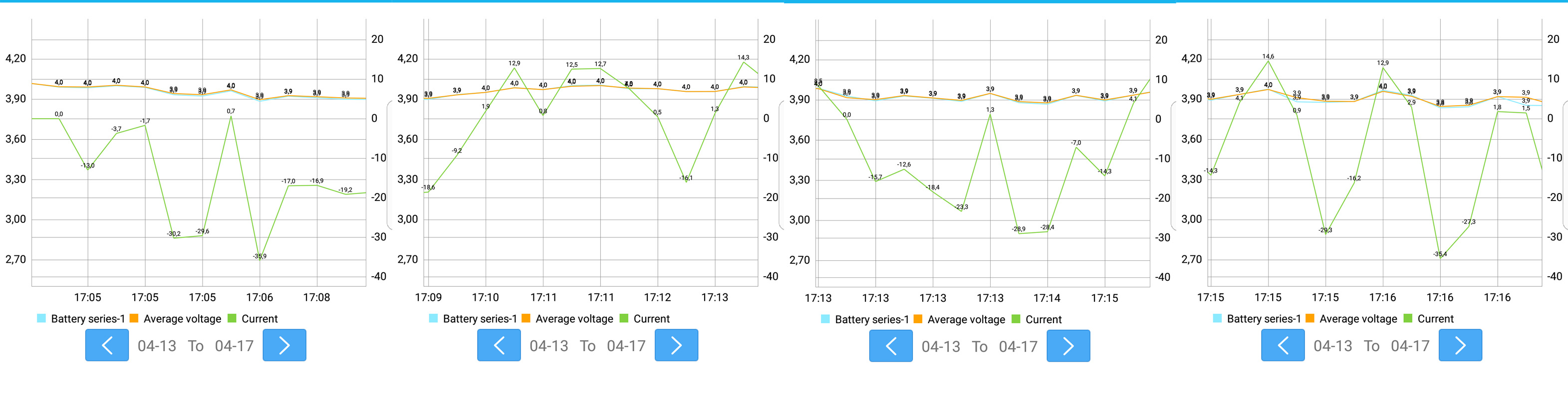 Hier ist übrigens ein Screenshot einer 2-Akku Testfahrt, die Akkus sind dabei bei ca. 80 % gewesen. Man erkennt die Stromausschläge beim Beschleunigen und den Rekuperationsstrom beim Bremsen. Der kann locker 16 A betragen.