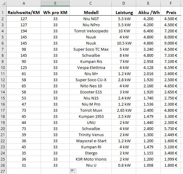 Tatsächlich gibt es ca. Werte von 30 - 60 Wh Verbräuche auf den Kilometer. Bei Niu gibt Niu selbst diese Werte an. Schwalbe, Vespa & Velocipedo kommen real auch tatsächlich auf die schlechten 60 Wh (die sind aber min. 30 kg schwerer als viele der anderen Modelle).
