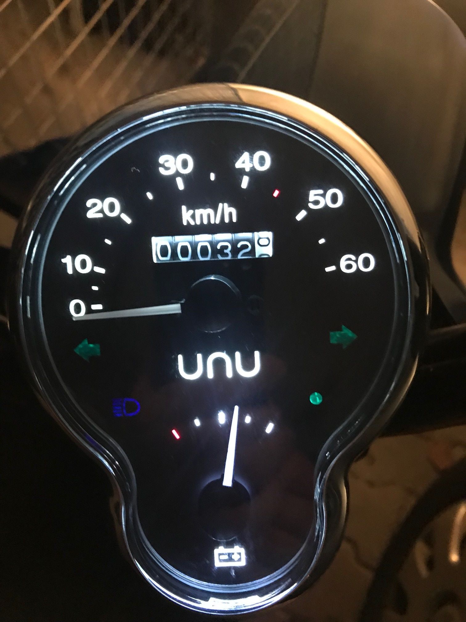 Der neue Tacho sieht so aus: Neu ist dass das Unu Logo nun anderer Stelle ist genau so wie die Beschriftung kmh. Ebenfalls neu bei mir aber ohne Funktion ist die grüne "An" Leuchte rechts. Außerdem blick das Akkusymbol nun bei geringem Akkustand und die Akkustandanzeige sieht leicht anders aus.