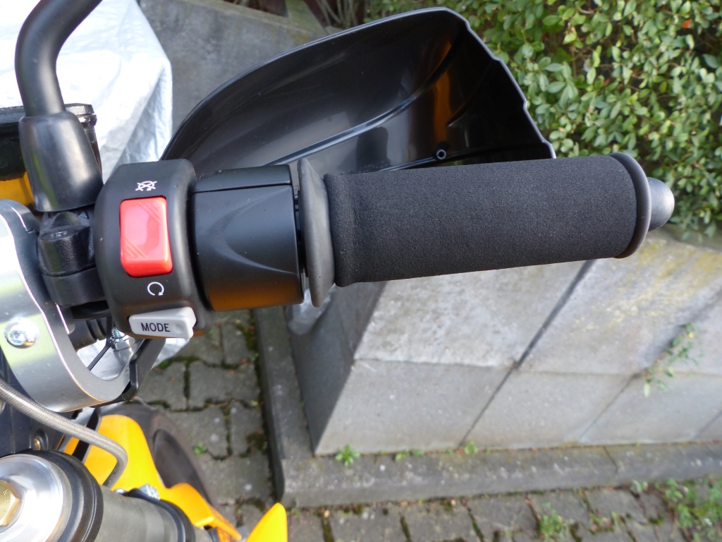 Und es ist wirklich so: da wo sonst der große Kippschalter für Abblend-/Fernlichtumschaltung ist prangt bei der S der rote Warnblink-Kippschalter. Fernlicht geht mit dem ganz kleinen schwarzen Knubbelchen an einem Ring direkt neben dem Griff an und aus - der direkt unterhalb des Spiegelhalters, und Lichthupe hat einen extra Momentanhebel vorn, im Bild oberhalb vom Spiegelhalter. Da muss sich jetzt meine linke Hand umgewöhnen...