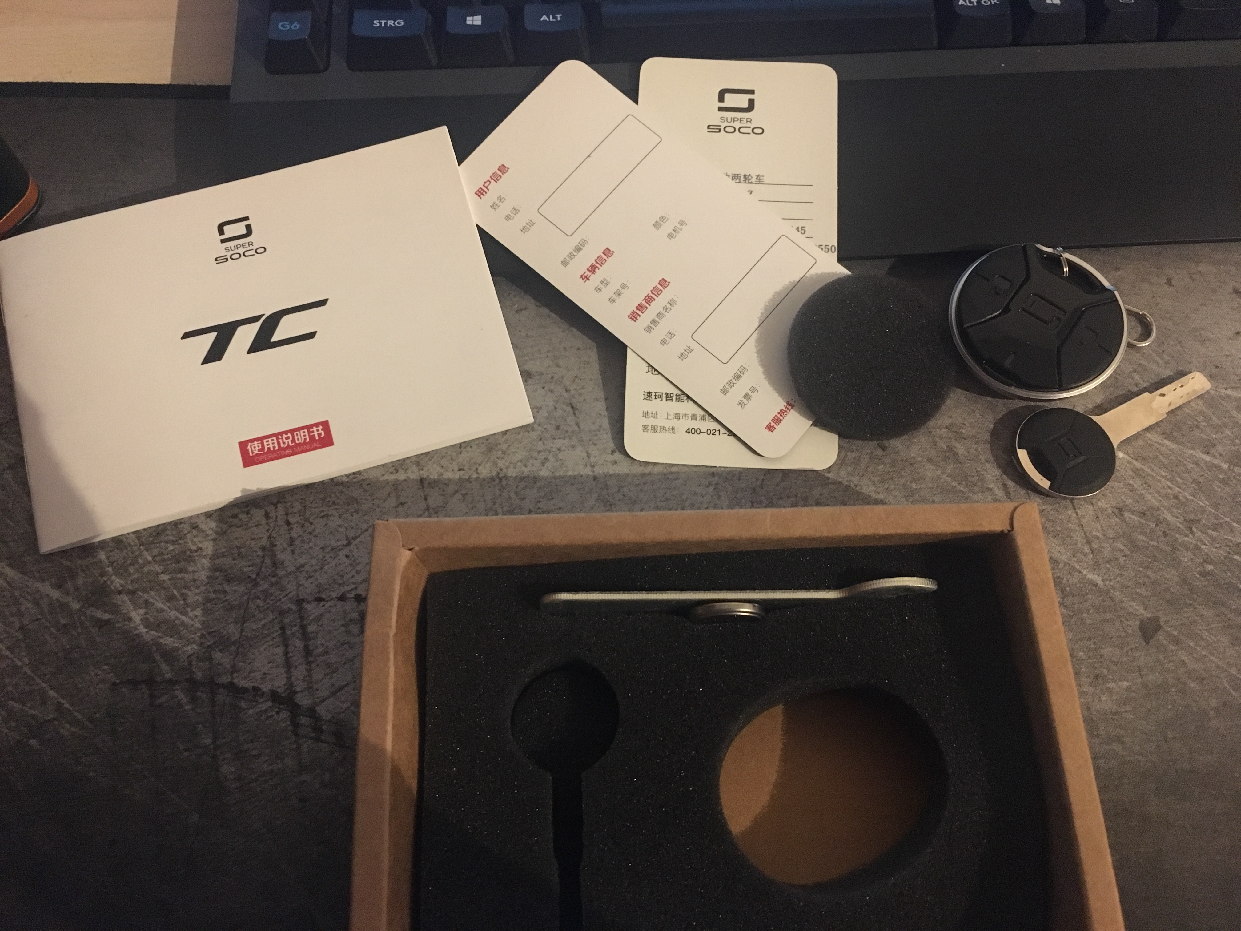 Ich habe auch nur die braune Schachtel ohne QR Code. Die QR Codes im Handbuch sind nur Links zum downloaden der APP. Konnte meine Super SOCO TC leider auch nicht registrieren.