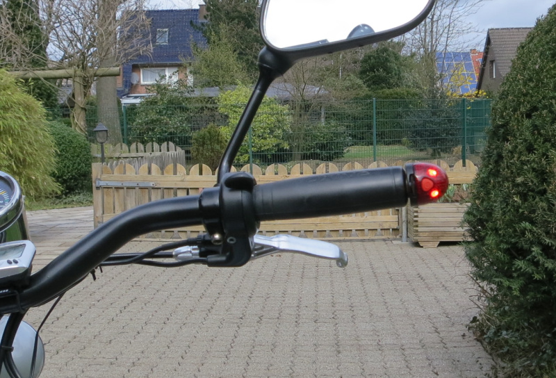 Fahrrad-Blinker geleistet. Für die Montage brauchte ich nur an den Enden die Lenkergriffe mit einem Teppichmesser auf Innenrohrdurchmesser aufschneiden und die Blinker hinein drücken.