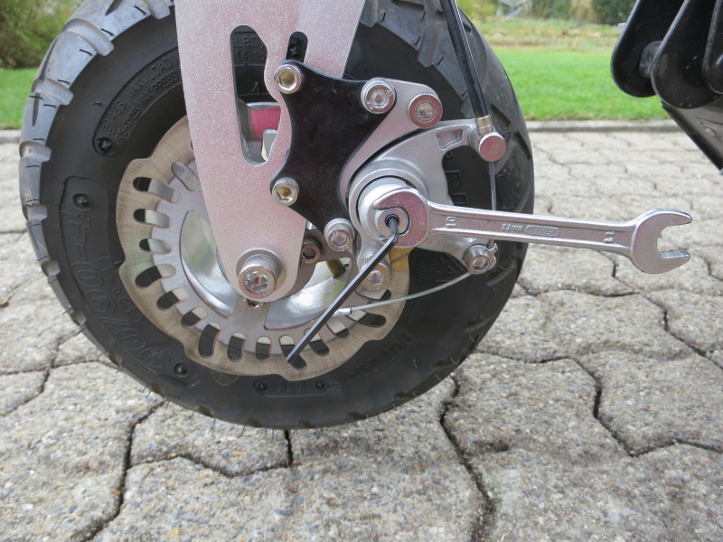 Durch drehen des Rades feststellen ob die Bremsscheibe einen Schlag hat. Da die Bremsscheibe aus dickem Blech und nicht aus Stahl ist, kann sie sich durch Gewalteinwirkung leicht verbiegen. Mit etwas Geduld kann man die Bremsscheibe aber wieder richten.