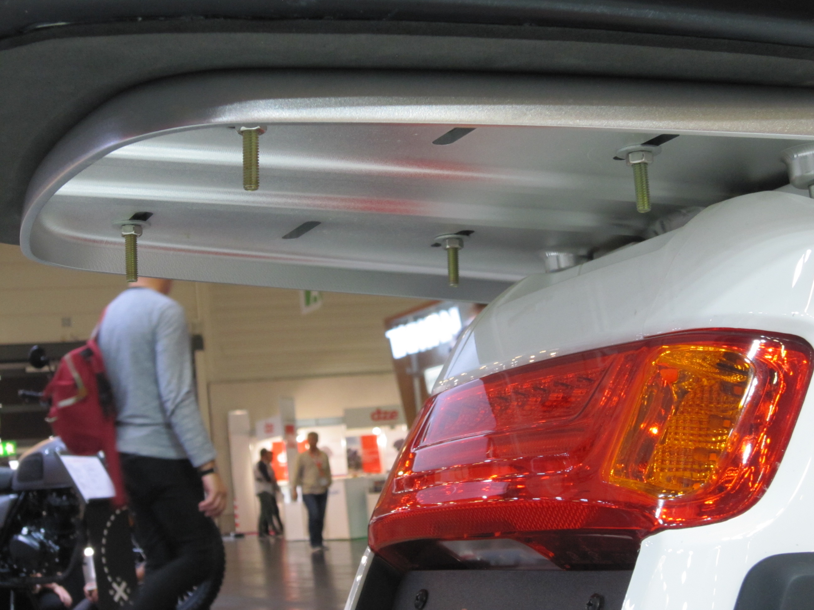 Wie man sieht, ist der Gepäckträger des Cargos zur Formstabilisierung an den Rändern nach unten durch eine Abrundung an den Außenkanten formstabilisiert und reicht weiter nach hinten, als der bisher verkaufte Gepäckträger. Die Durchführung in der Mitte, wo der Originalgepäckträger verschraubt ist, ist frei, bzw. es ist die Kunststffblende davor. Darauf kann man verschieden Topcases oder Lieferboxen verschrauben, weil einige Schlitze im Blech dafür vorhanden sind, so lassen sich auch problemlos Trägerplatten von Topcases mit diesem Gepäckträger verschrauben. Diese Variante ist natürlich nur für die gekürzte Sitzbank möglich und kann nicht (ohne weitere Modifikationen) am bestehen N-Modellen angebracht werden.