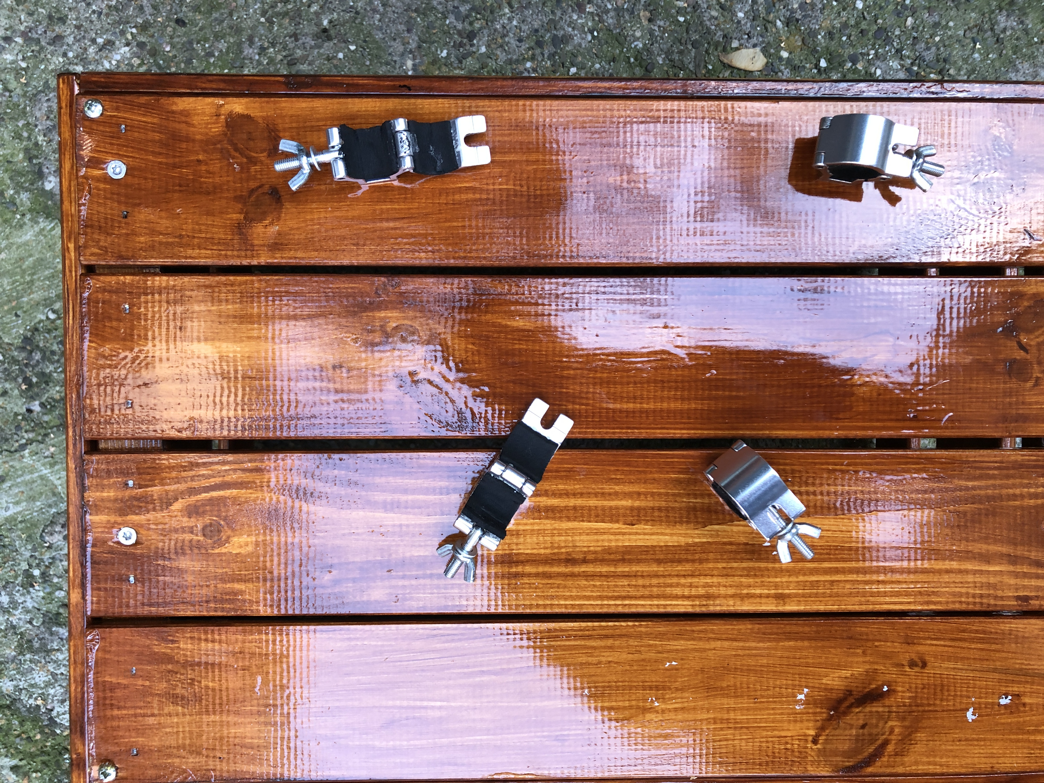 Fündig bin ich bei Ikea geworden. Dort habe ich mir die Holzkiste gekauft, mit Farbe und Bootslack bearbeitet. Anschließend habe ich bei Musicstore Klemmen, die eigentlich für die Befestigung an Bühnen gedacht sind.
