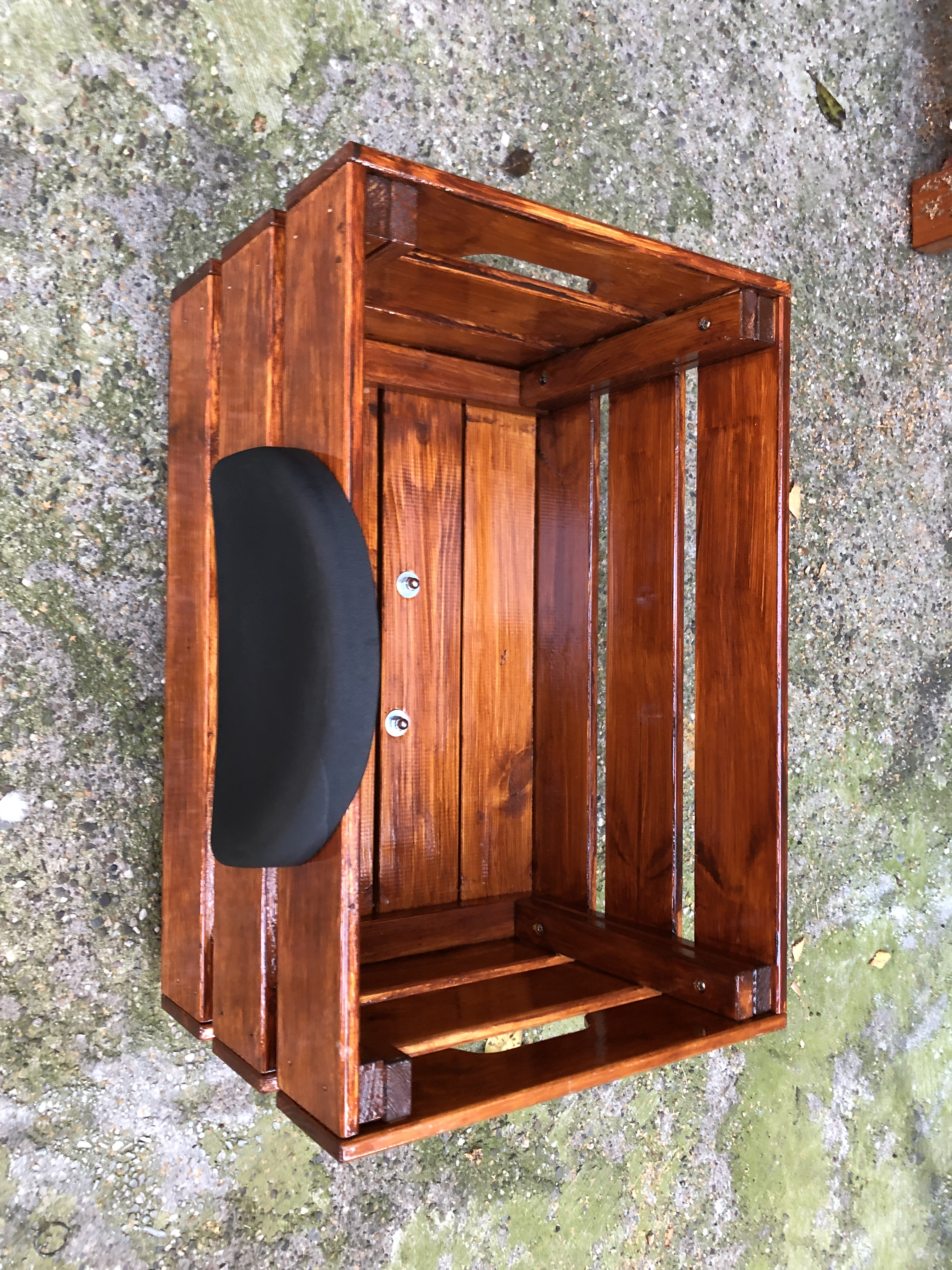 Fündig bin ich bei Ikea geworden. Dort habe ich mir die Holzkiste gekauft, mit Farbe und Bootslack bearbeitet. Anschließend habe ich bei Musicstore Klemmen, die eigentlich für die Befestigung an Bühnen gedacht sind.
