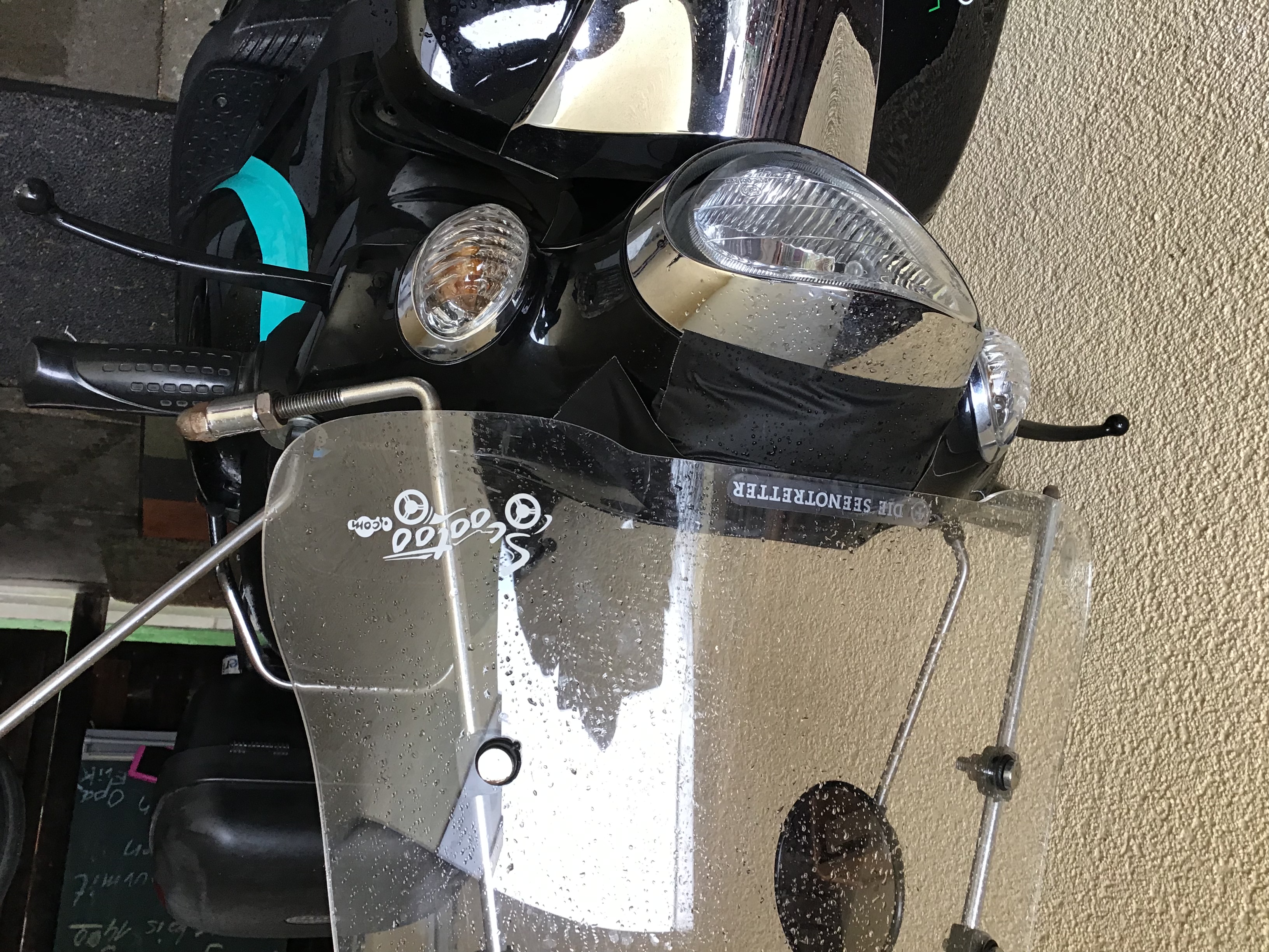 Es fehlen die beiden vorderen Blinker, ehemalige Montagelöcher sind vorhanden, die jetzt geklemmten weisen Gläser haben keine Zulassung.