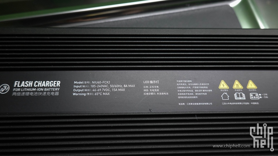 3.3 kg, lüfterlos, 15A, 69.7 V, wird 65 C heiss beim Laden. Modell NIU60-FCX2 "X2 flash charger"