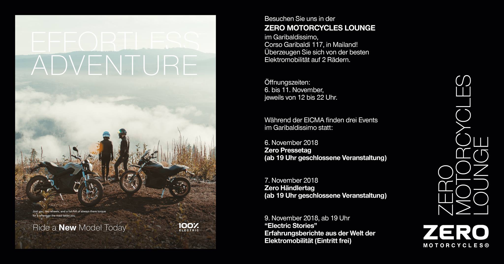 Die Eicma rückt näher! Dieses Jahr hat Zero entschieden etwas anderes zu machen. Von 6.11. bis 11.11. haben sie deshalb eine exklusive Zero Motorcycles Lounge im Zentrum von Mailand eingerichtet. Besuchen kann man diese in der Corso Garibaldi 117, Mailand, täglich von 12.00 bis 22.00 Uhr.
