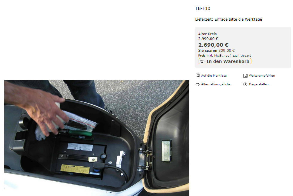 Hallo bin grad dazu gekommen und möchte hier mal sagen, das mein tinbot f10, den ich im Februar 2019 gekauft habe, einen tragbaren wechselakku besitzt. Ich komme mit vollem Akku auf ca 48 Kilometer/std. Leider wird er mit leerem Akku etwas langsamer und kommt bei 40-50% nur noch auf ca 45 std/k. Bin sehr zufrieden mit ihm. Bequem zu fahren, guter Service beim Händler in Wiesbaden und bisher zumindest auch sehr zuverlässig.