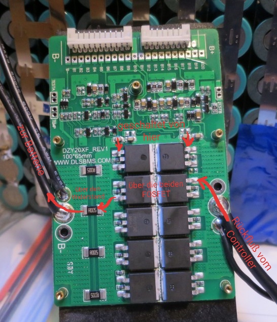 4. Entlädt sich während der Fahrt eine Zelle unter 2,8V schalten die MosFets ebenfalls den Laststrom ab.