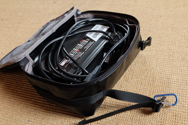 In diese schmutz- und wasserabweisende Tasche passt das Schnellladegerät incl. der Anschlussleitungen, eingewickelt in Luftfolie als Schutz vor Erschütterungen, wunderbar hinein. An den Klipverschluss der Tasche habe ich dann einen Karabinerhaken drann gemacht.