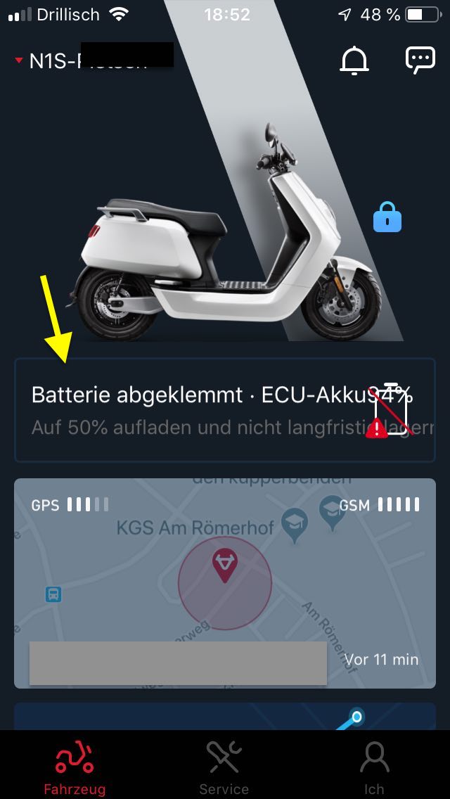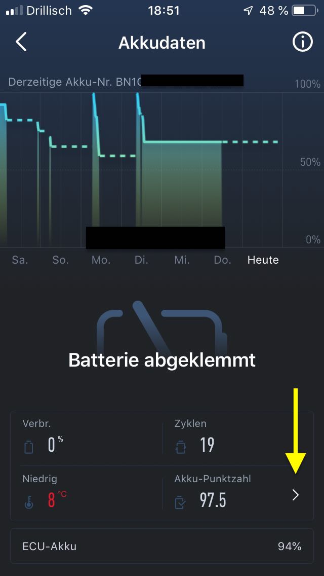 Die NIU-App gibt da einen Überblick. NIU vergibt da beim Start 100 Punkte und reduziert bei jeder Vollladung den Wert um 0,1 Punkte. Für eine längere, falsche Lagerung gab es auch einen Fall, wo 40 Punkte dafür abgezogen wurden. Für eine Akku-Vollladung zu Servicezwecken werden 0,2 Punkte abgezogen, wahrscheinlich ist das ein „Cycle“ aufruf (Vollladen, Entladen, Volladen).