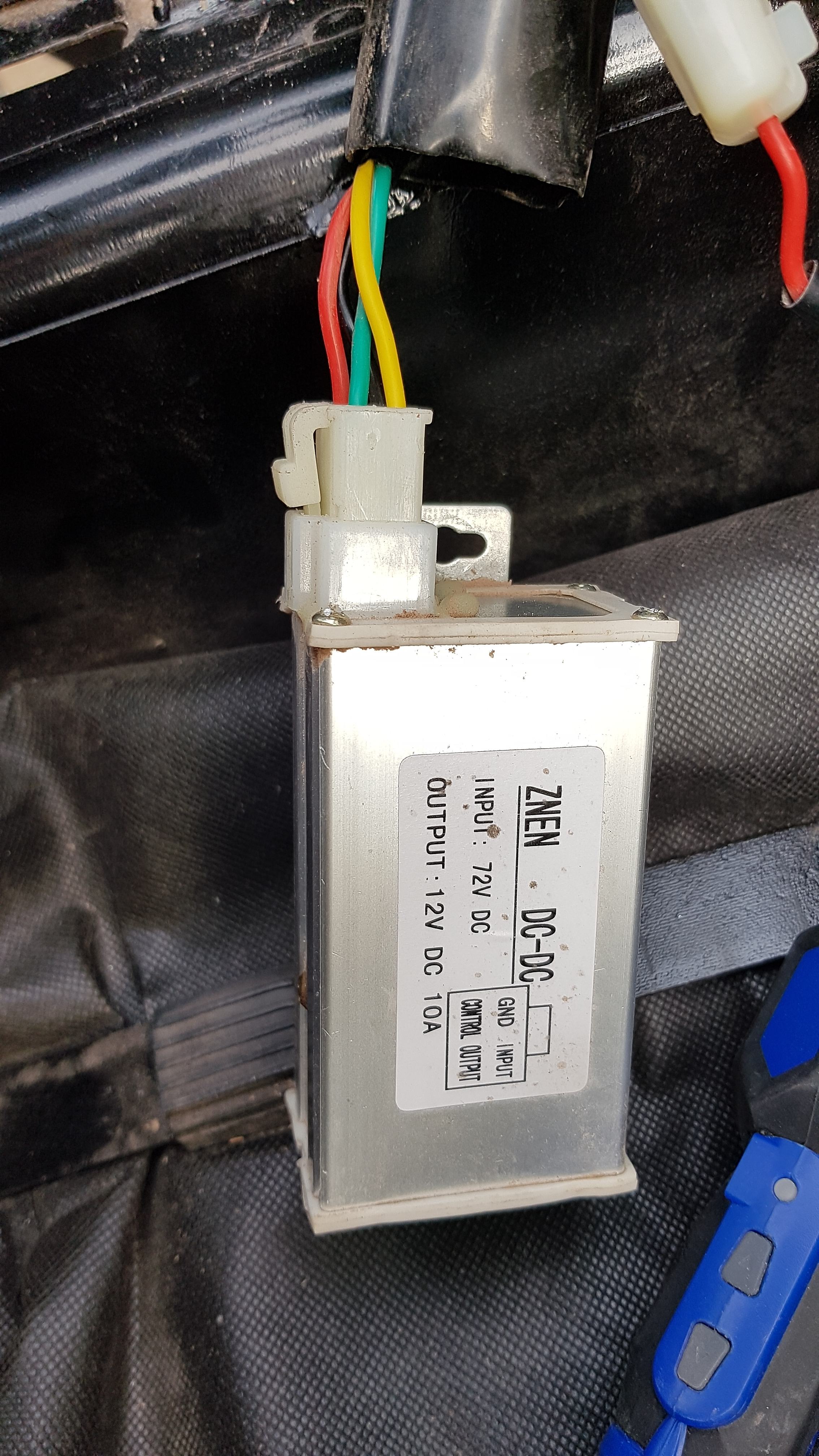 Ich habe bei mir 4 Stück DC DC Wandler 36V...72V auf 12V 10A in der Rollerschublade - allerdigs nur mit 3 Kabeln rot 36...72V, gelb 12V und schwarz. Einer kostet 10,- Euro plus 1,45 Euro (Marke) Versand.