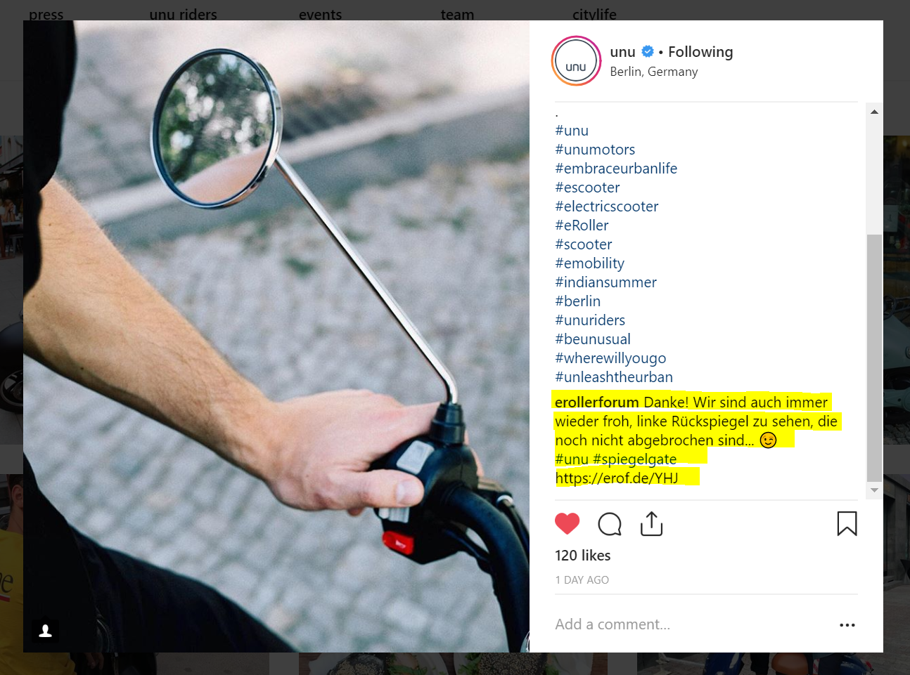 Pünktlich bei 4000 km ist mein zweiter, linker Spiegel auf unebener Straße, während der Fahrt abgebrochen. Ziemlich genau an der gleichen Stelle wie der erste...Herr_K._aus_B. hat geschrieben: Di 9. Okt 2018, 06:02[...]Am vergangenen Sonnabend nahm ich Unu wieder in Betrieb beim Stand 2005 km, das neue Tachometer ist noch nicht getauscht.doinels hat geschrieben: Mo 8. Okt 2018, 12:19 [...] Ein Spiegel brach ab und das UNU-Zeichen vorne fiel während einer Fahrt ab. [...]