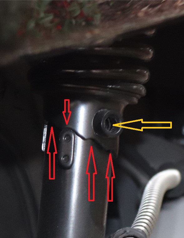 Stecke das Werkzeug in das mit dem gelben Pfeil markierte Loch und drehe auf die gewünschte Stufe. Die roten Pfeile sind die verschiedenen Stufen der Vorspannung.