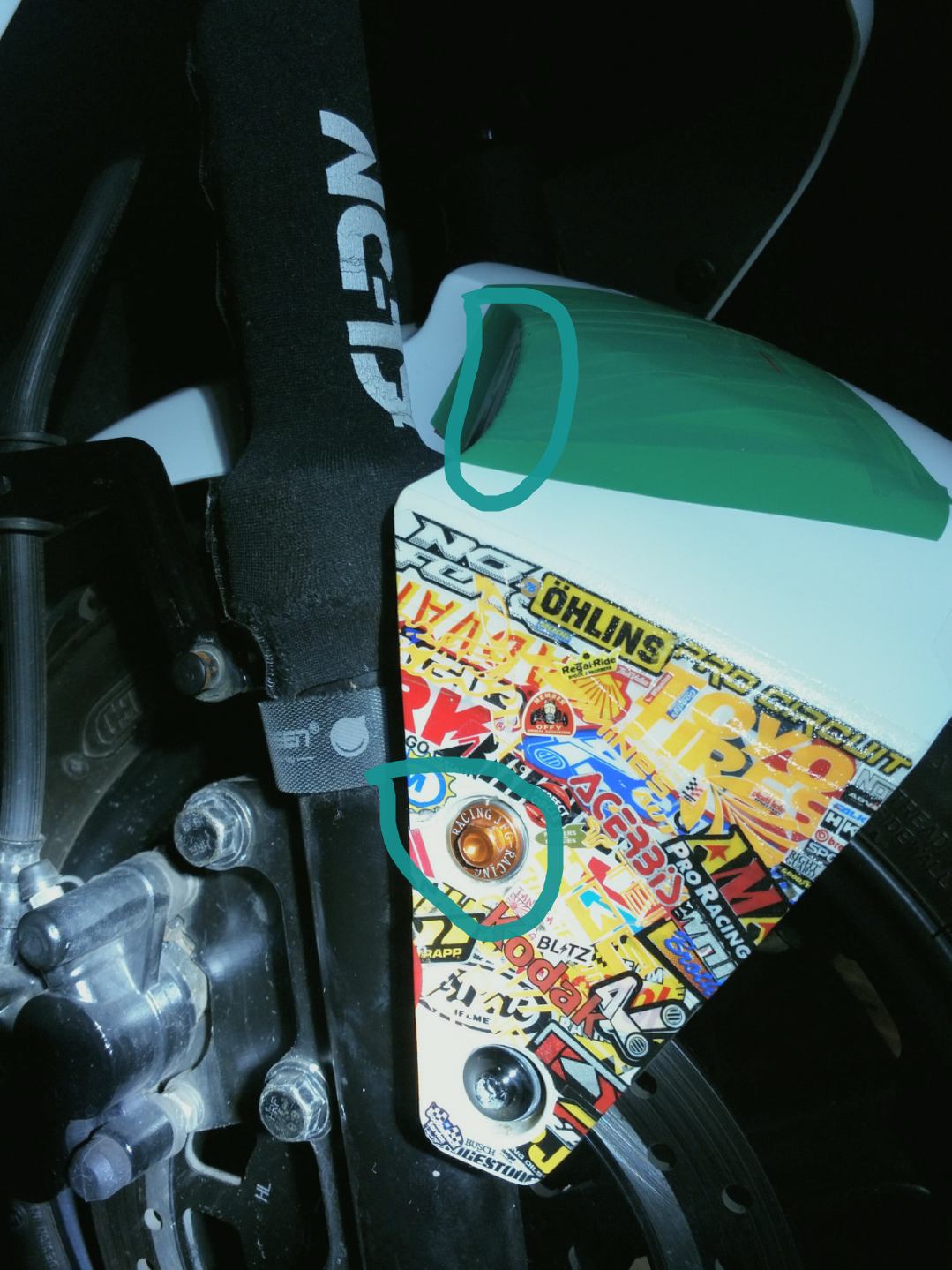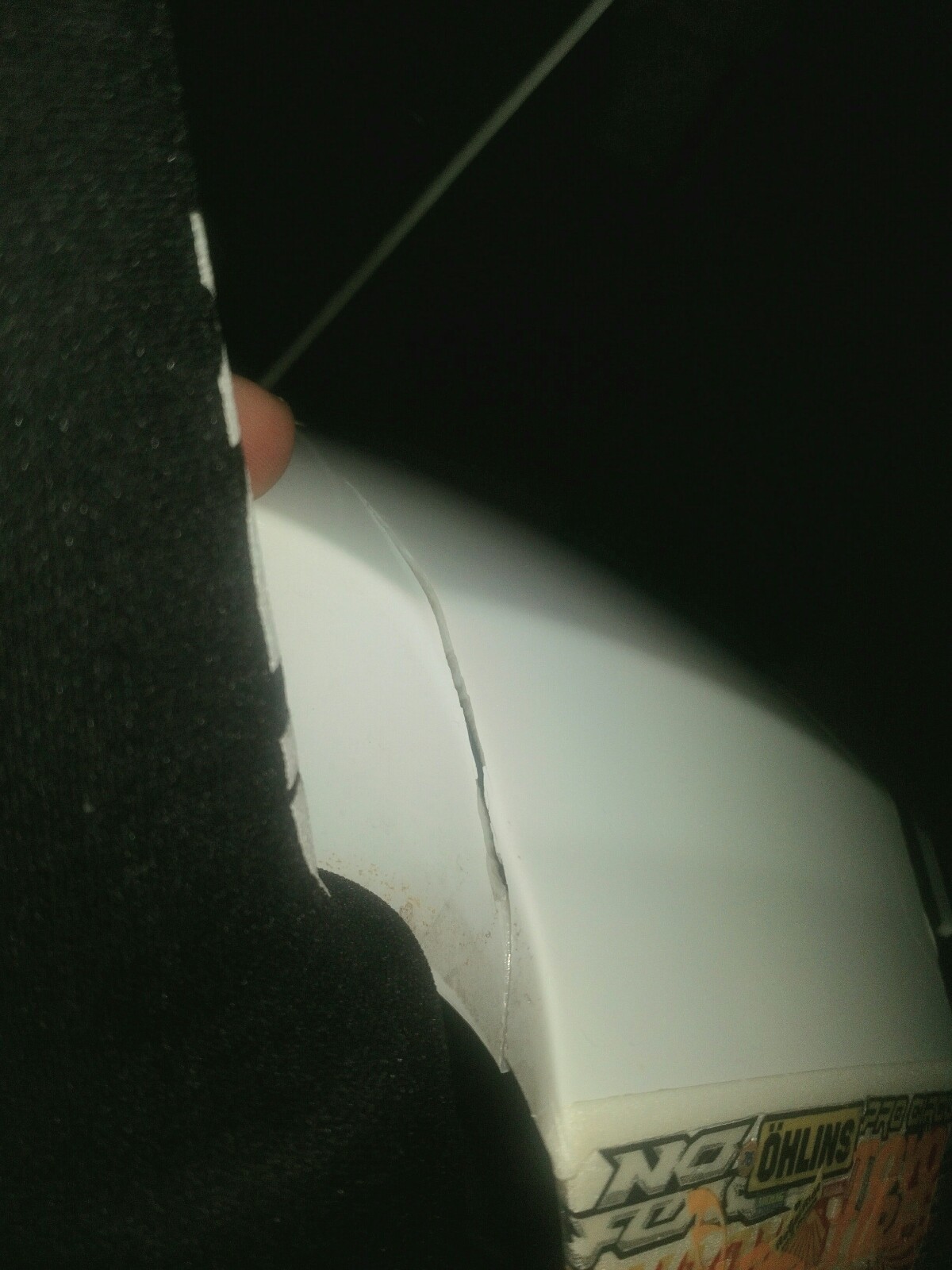 Mein Kotflügel vorne ist mittlerweile an drei Stellen gebrochen. Erst links, hab ich getaped und ein paar Sticker drauf gemacht. Kurz darauf war auch die rechte Seite gebrochen, auch getaped. Nun bei genauerer Betrachtung seh ich, dass auch die rechte Seite rund um die obere Schraube gebrochen ist, was sich echt schlecht kleben lässt.