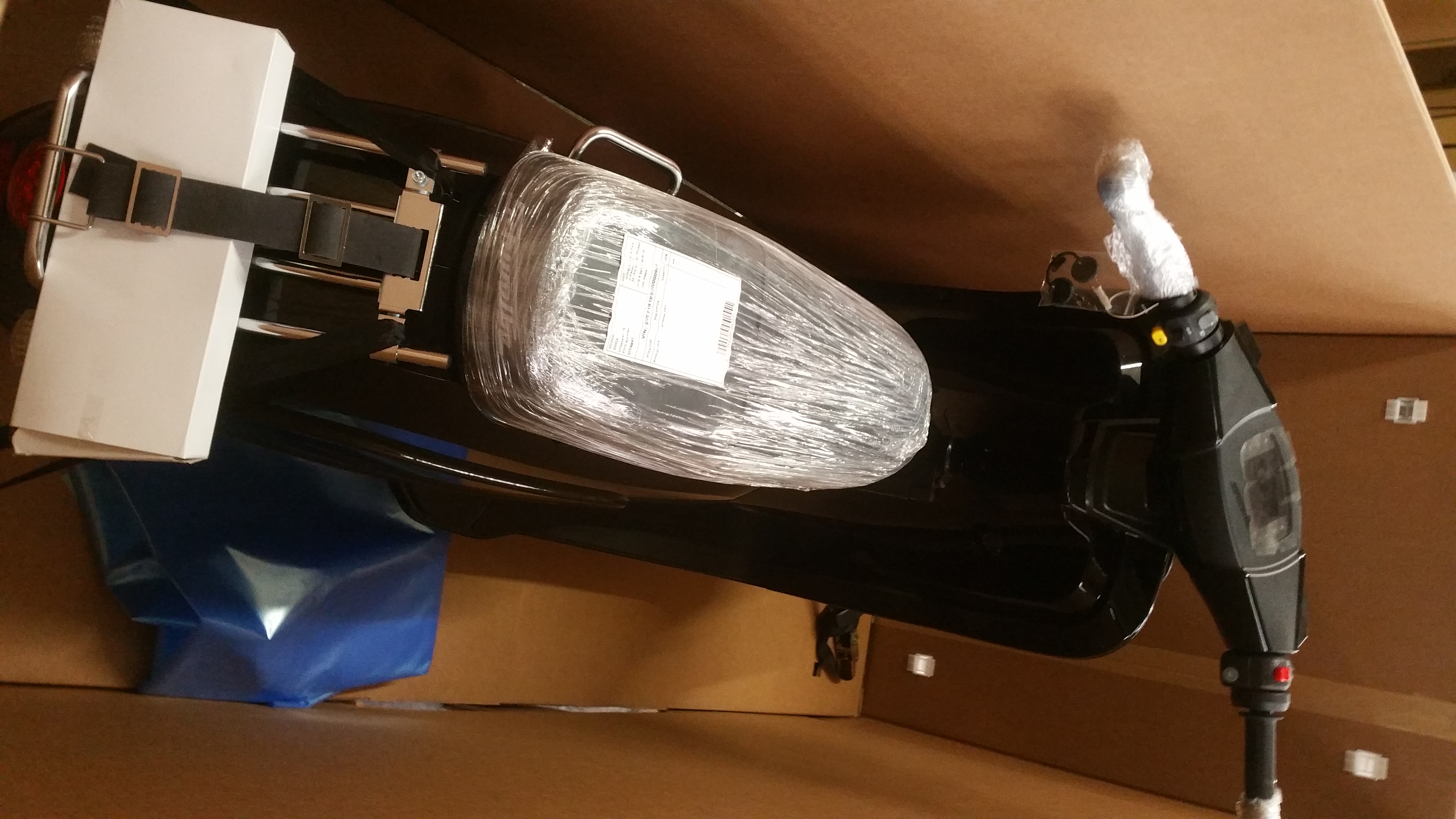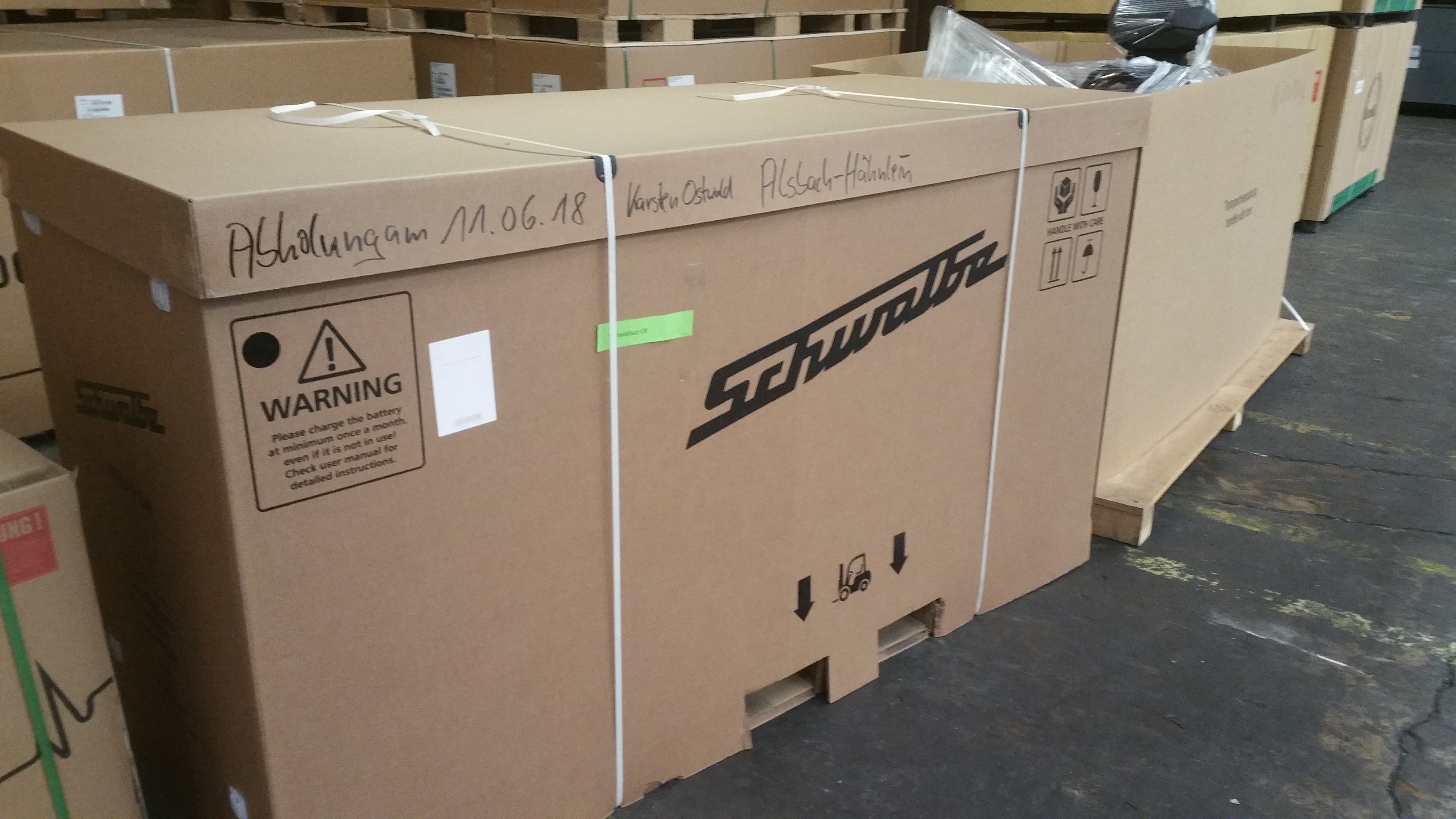 Nun, Pic Up bedeutete in meinen Fall ganz einfach das Fahrzeug bei der Spedition abholen. Die Schwalbe war weitestgehend vorkonfiguriert und nur wenige Teile mussten angeschraubt werden. Ein netter Herr von der Spedition unterstützte mich dabei. Ist auch ganz sinnvoll den die Schwalbe ist alles, aber nicht leicht. Geliefert wird sie in einem großen Karton.