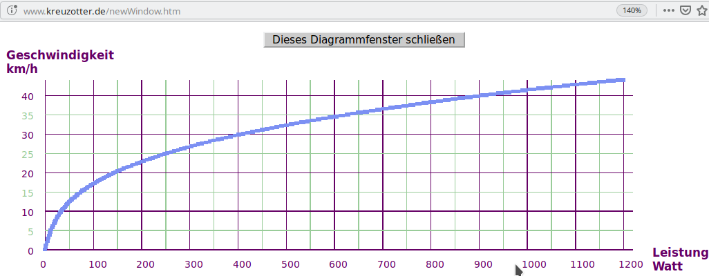 Ca. 400 Watt bei 30 km/h stehen ca. 1200 Watt Verbrauch bei 45 km/h gegenüber (Windwiderstand).
